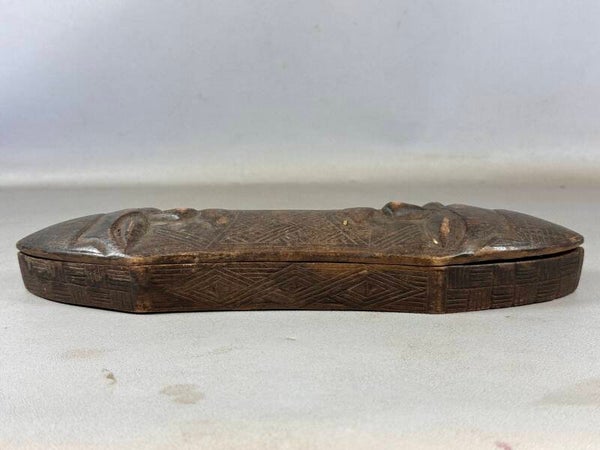 This is a beautiful incised carved wood half moon shaped lidded Tukula Powder Box carved by the Kuba people of the Congo. Tukula is a red powder that is finely ground from parts of the Camwood tree. To the Kuba it is an immensely valuable substance, the Western equivalent of gold. Tukula is both auspicious and prophylactic. Its earthy or purplish red color is used abundantly in decoration, rubbed onto items such as cups, containers, figures, weapons, oracles etc. to honor and beautify them. Tukula is also used to bless people like new born babies, pregnant women, new mothers, warriors, the diseased and the deceased. It's usually applied after having been mixed in a special wooden or clay dish with oil extracted from palm-kernels. Tukula will be preserved in special decorated wooden boxes that come in many shapes, sizes and designs. Each Box is uniquely carved by the family. This particular Tuluka box is intricately carved and shaped.
