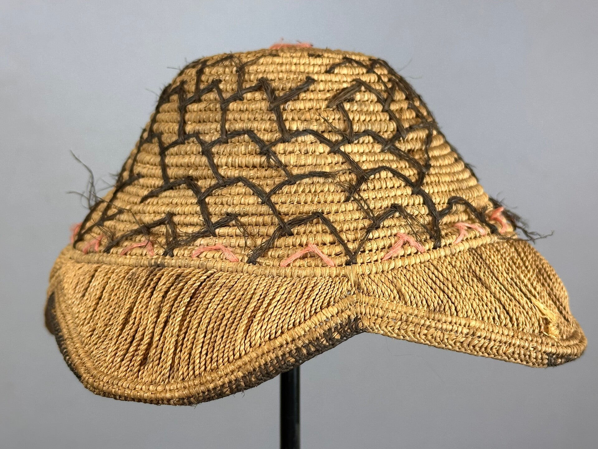 Old African Raffia fiber cultural ceremonies hat from the Kuba people, Congo.