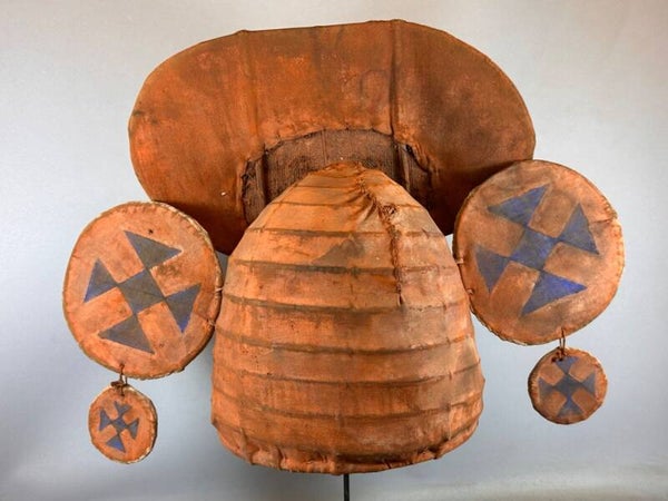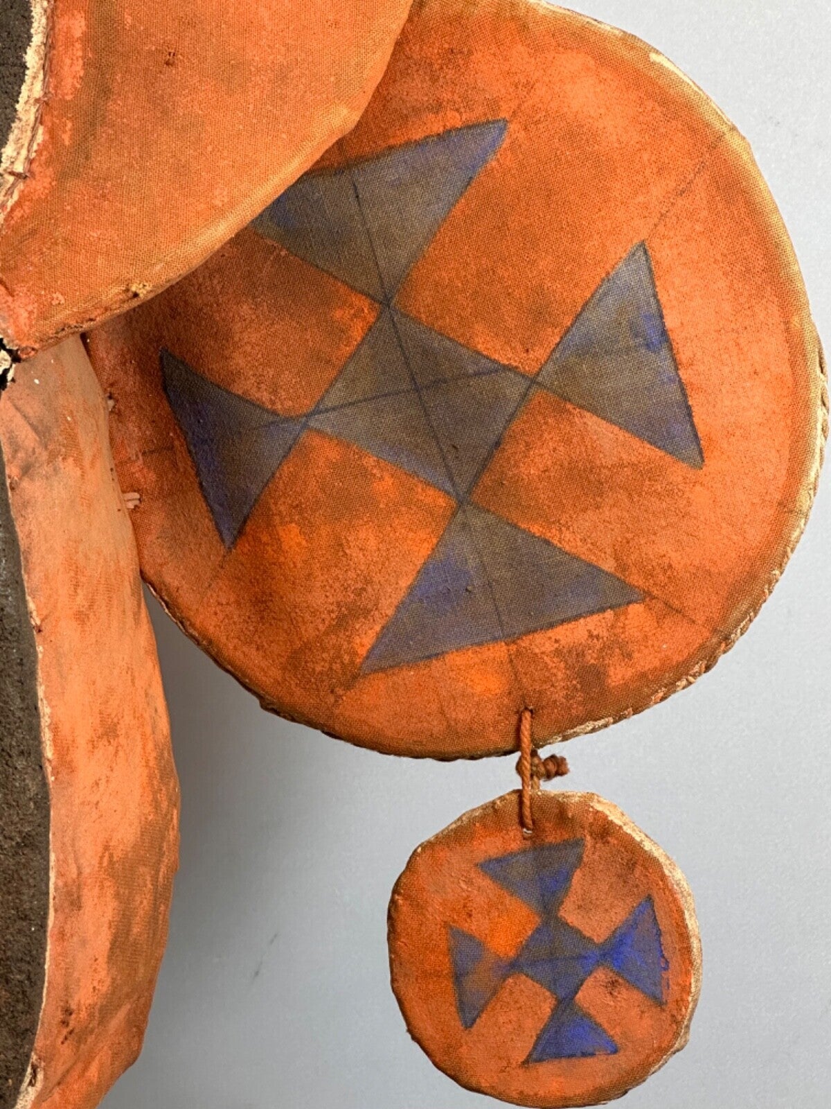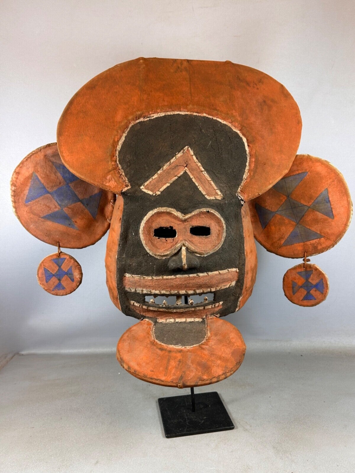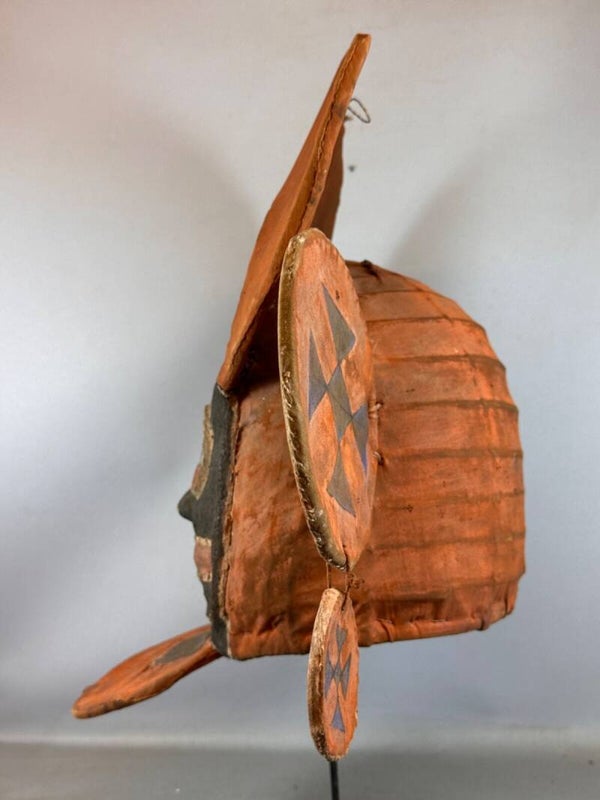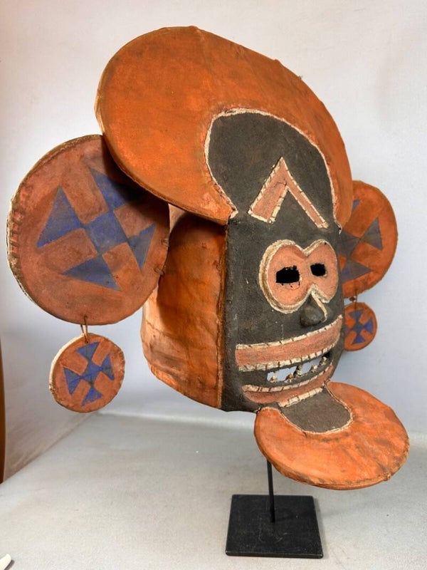 Rare, polychrome decorated mask, made of colored textile, stretched over a frame of vegetable fibers and rattan spokes. The ears are movable, with round plates with ornaments on the ears.