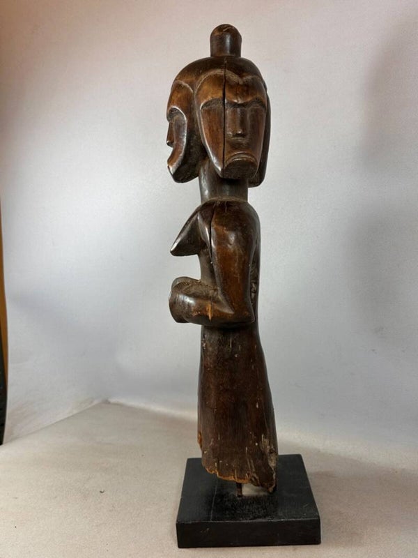 Large Old African Three-headed Fang anthropomorphic sculpture on stand from Gabon.