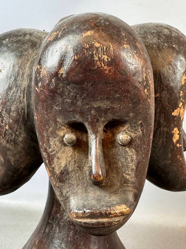 The Fang ethnic group number about 900,000 and constitute a vast village communities, established in a large zone of Atlantic equatorial Africa: consisting Cameroon, continental Equatorial Guinea and northern part of Gabon, on the right bank of the Ogowe River. Fang people used masks and statues/figures in their secret societies, the “bieri”, or ancestor sculpture. They celebrate this figure when a new crop was planted or before fishing or going hunting. The Fang bieri has the proportion of a new born, this emphasizing the groups’ continuity with its ancestor and with (three faces); the three classes of society: the “not-yet-born”, the living and the dead. This stunning fine figure shown here was also used for the initiation of young males into their secret societies as members.