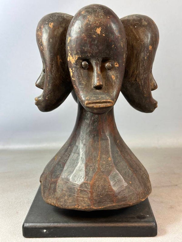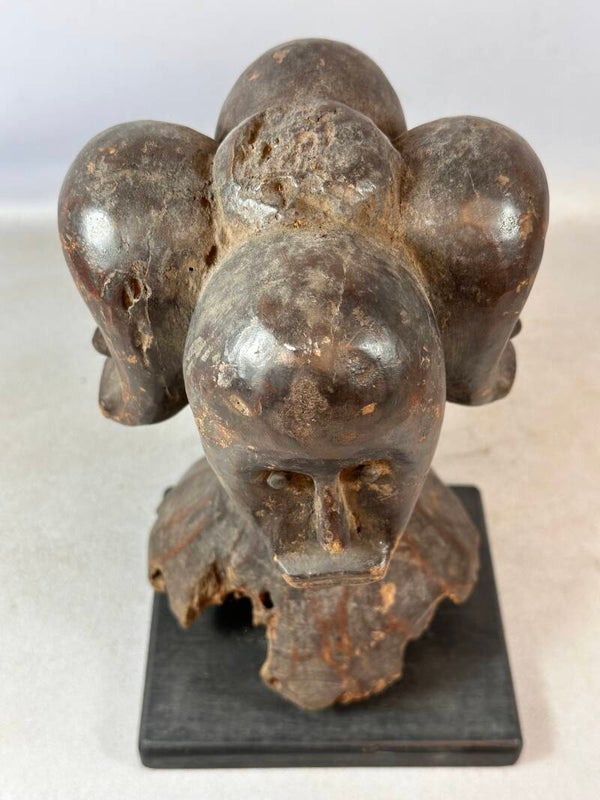 Old African Reliquiar Byeri Fang anthropomorphic 4 faces sculpture on stand from Gabon.