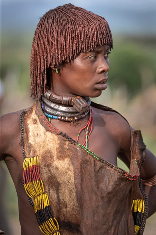 The Hamar, live in South Omo River Valley in Ethiopia. They are easily recognizable by their coiffures, elaborately decorated goatskins, colored with beads and cowries.Women wear thick necklaces indicating their marital status. They wear a leather long tipped necklace if they are the first wife and only two iron necklaces if they are second, third or fourth wife to one man.