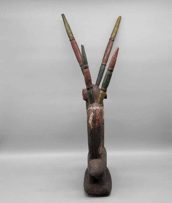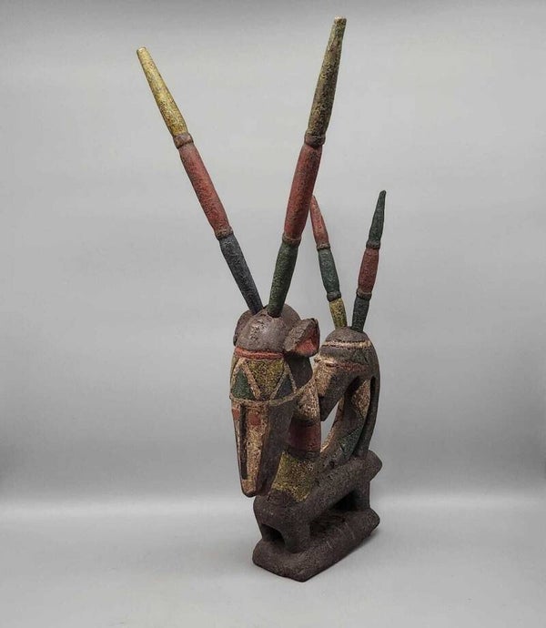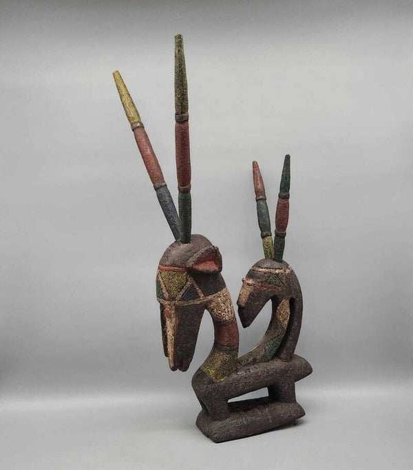 The Bambaras are a people from western Africa, living in agriculture, the culmination of their production of sculptures is inscribed in agricultural rites. During the agricultural festivals of the society tyi Wara, which means "champion of the crops", the farmers wear masks representing an antelope. The antelope is a mythical animal for them because it has taught them to work the earth. In order to obtain an abundant harvest, they dance during planting and harvesting by imitating the step of the antelope. The horn is said to be the symbol of the growth of the millet.