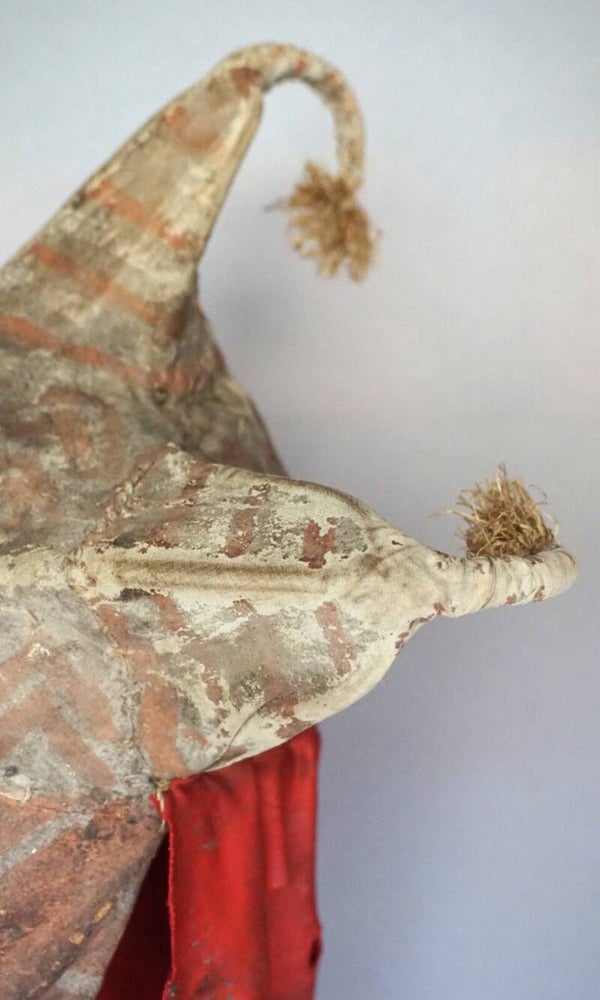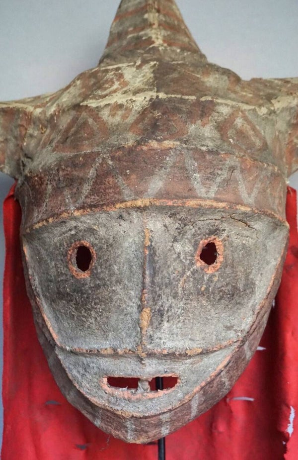 This ancient African mask is composed of a covered wooden structure. The facies is simple and typical, of superb quality and very well preserved. The braided headdress was accompanied by a full costume based on the same two-tone patterns.