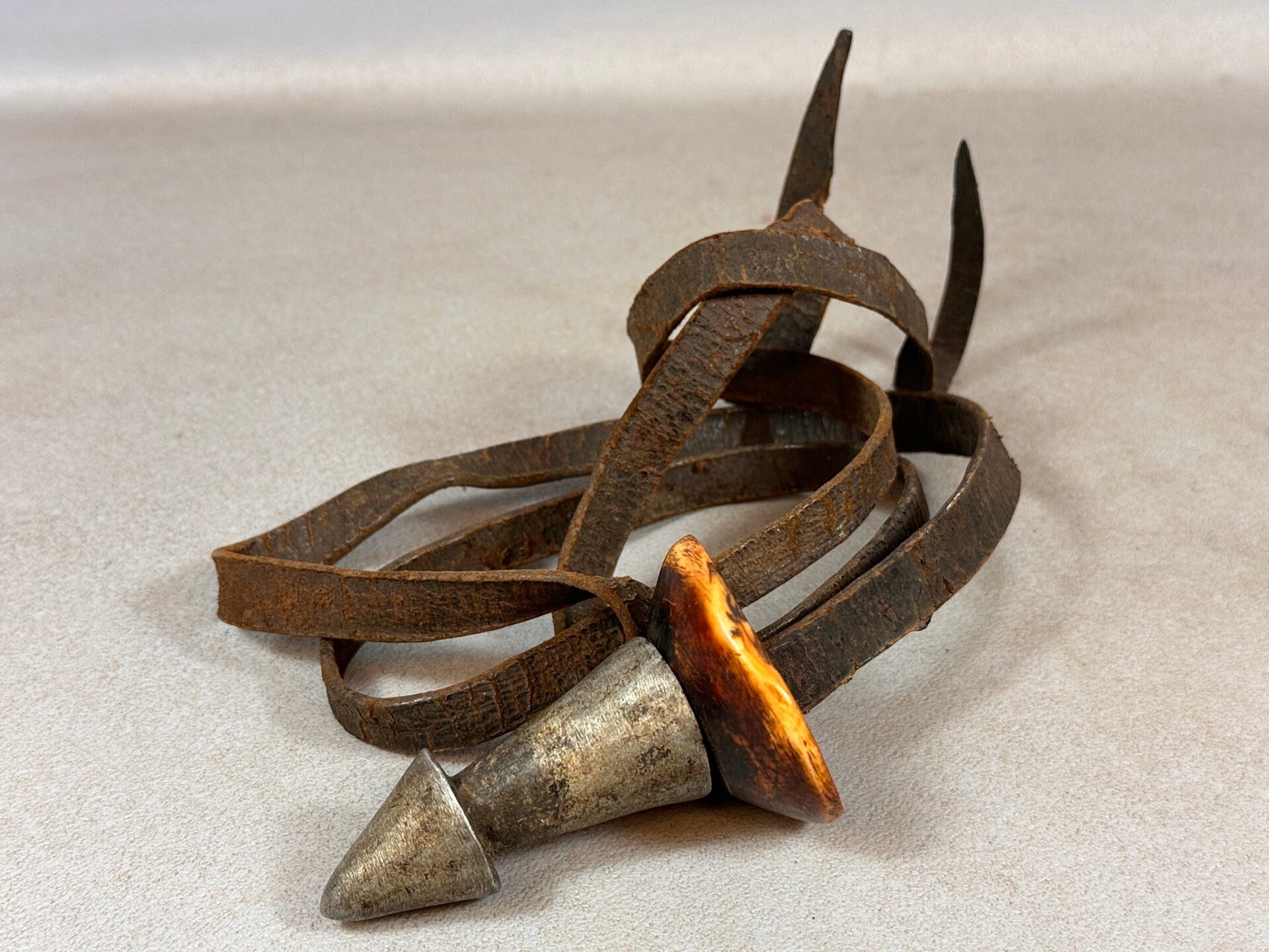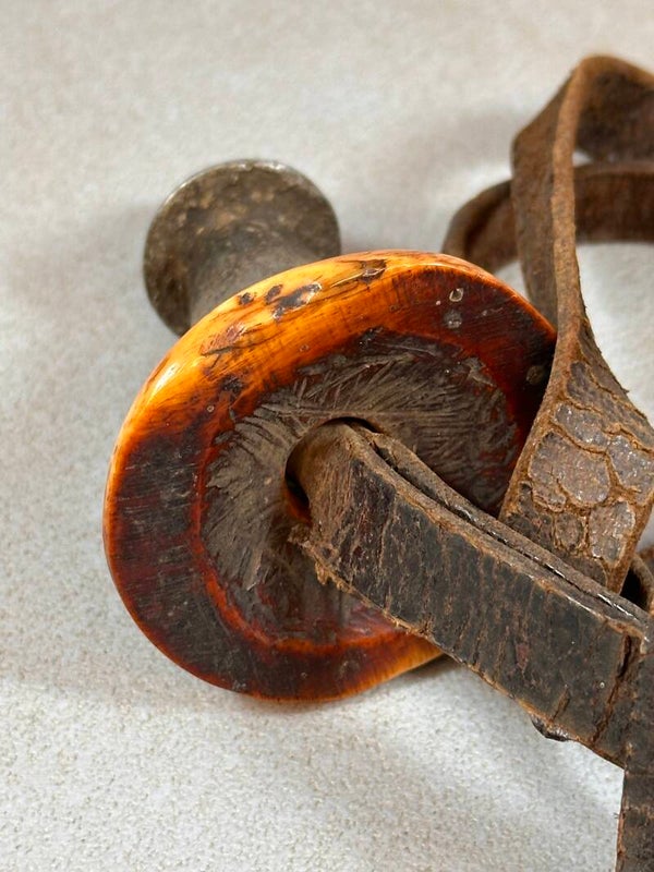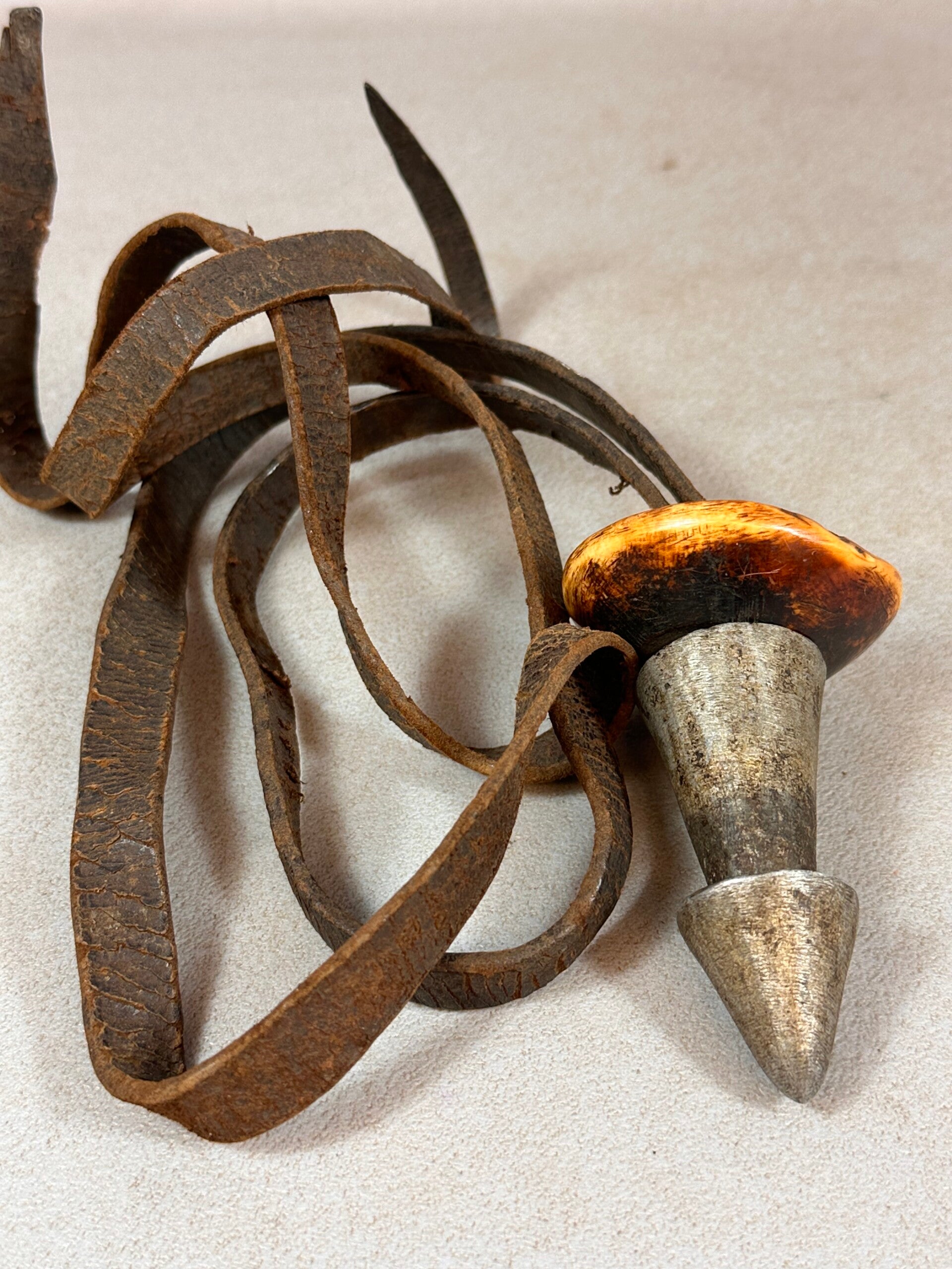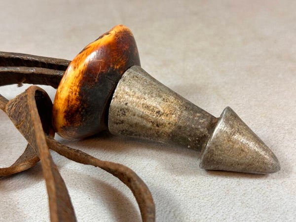 The ornament is handmade from natural materials and has a metal conical tip attached to a semi-polished amber bone at the base of the Kallacha. It hangs on an old original leather cord. These ornaments are rarely found outside of Ethiopia and are highly prized by collectors of African tribal art and ethnographic artefacts.