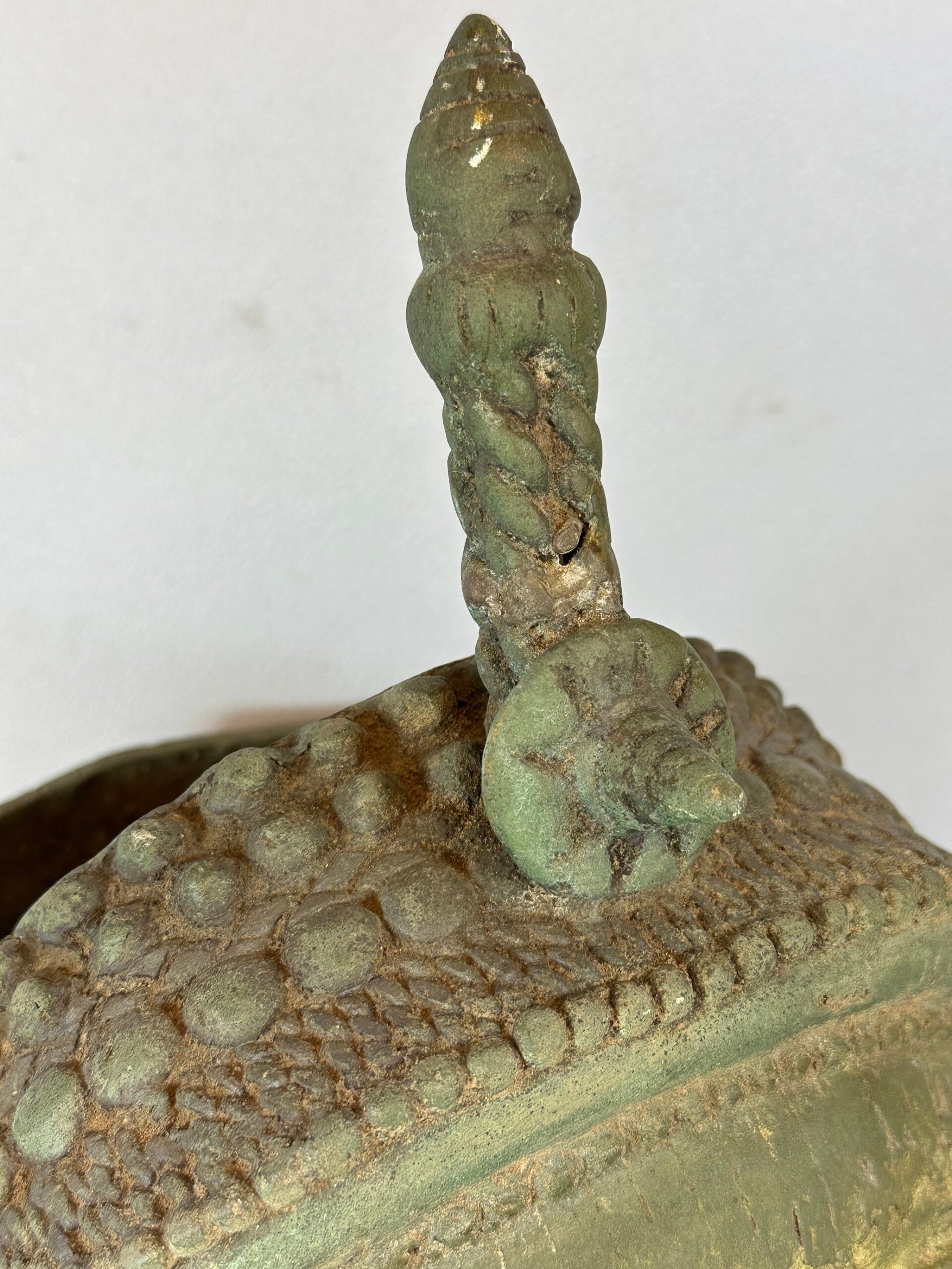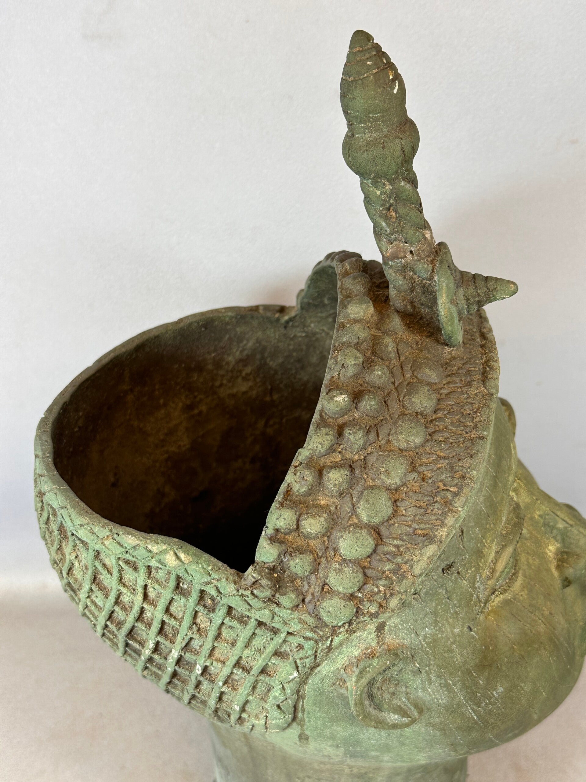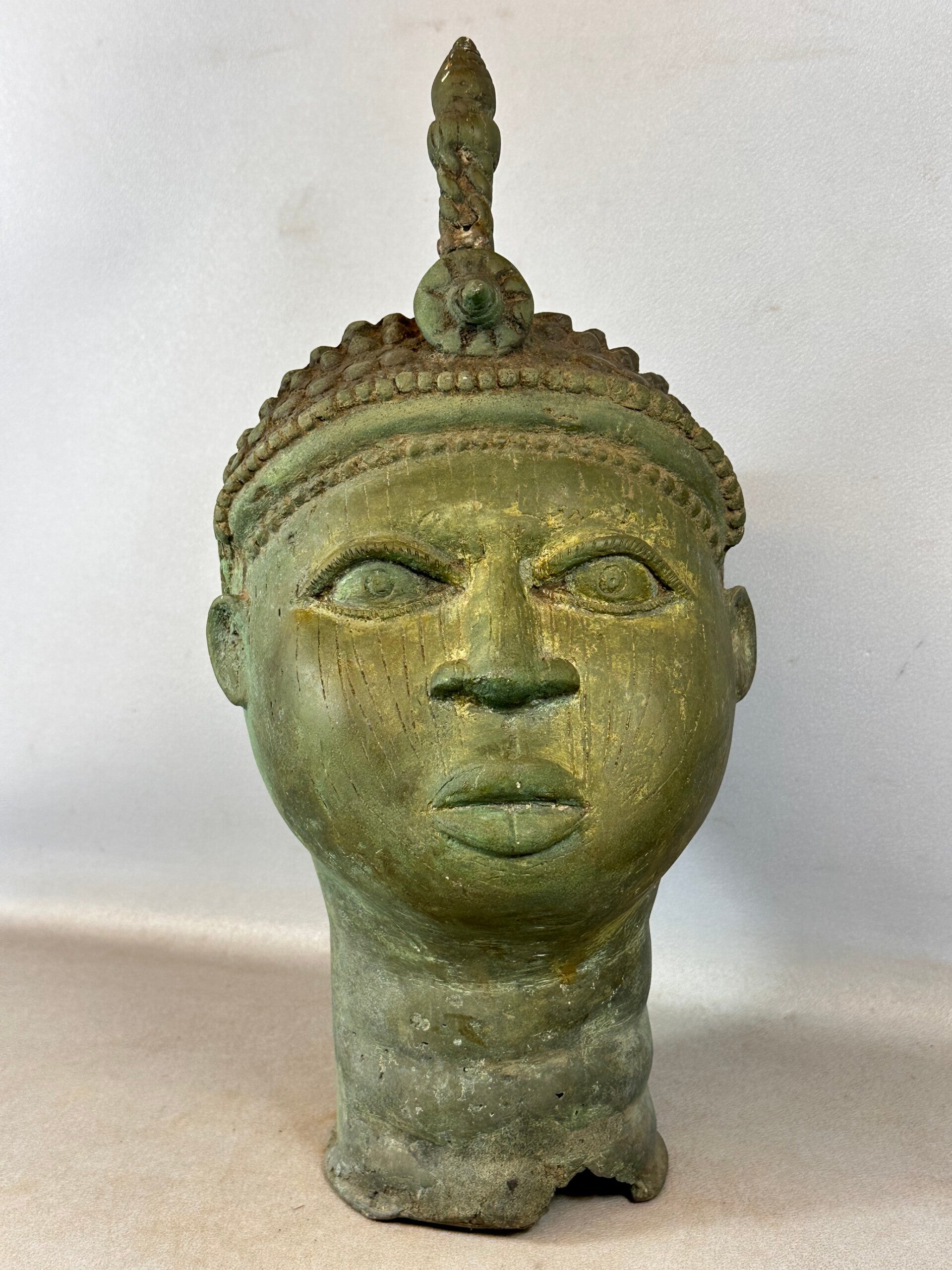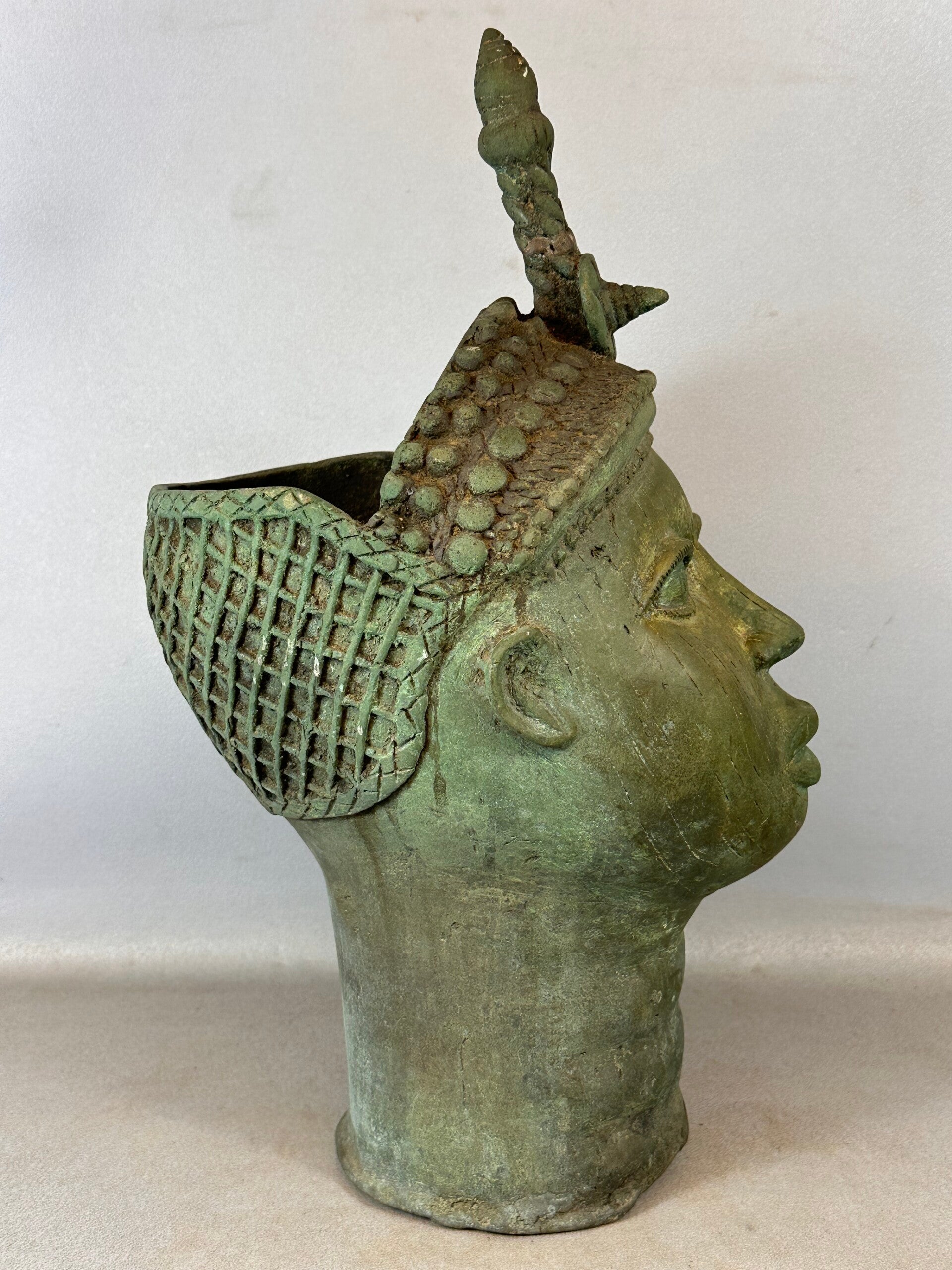 Impressive African bronze head inspired by traditional Benin royal portraiture. The sculpture shows detailed decorations on the headdress and facial features, reflecting the classic style of historical Benin bronzes. The piece is hollow with an open top and bottom, often characteristic of ritual or commemorative use.