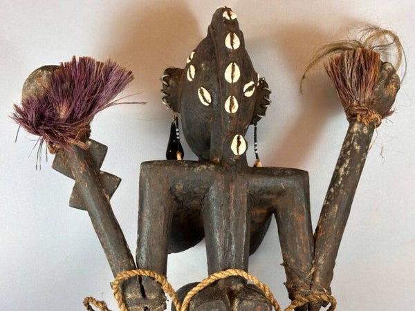 Dogon art is not a single fixed style as has been often characterized in discussions of their sculpture, for the age of Dogon art extends to the past as early as the 12th century and continues to be created in the present with a number of sub-styles measured against the core of an identifiable Dogon art and style. The Dogon interchange stylistic elements with neighboring groups producing an interesting hybridism in some of their interesting sub-styles. This sculpture reflects an influence that neighboring groups can have on the well defined core of Dogon sculpture. West of the Dogon heartland the Dogon interact with the other major art producing people of Mali, the Bamana (Bambara). These figures show the influence of the Mande speaking Bamana (the Dogon are Gur language speakers – different language, different cultures!) in sculptural attributes well defined. These include a squared body, keel shaped head and ‘U’- shaped ears. A Bamana blacksmith could easily have carved the figure. If truly a Dogon figure it represented an ancestor identified to an individual, family, village or region. If an ancestor it represents either a familial ancestor or one of the original eight Nommo who descended to earth to create us, the world and continue to be interested in the affairs of man.