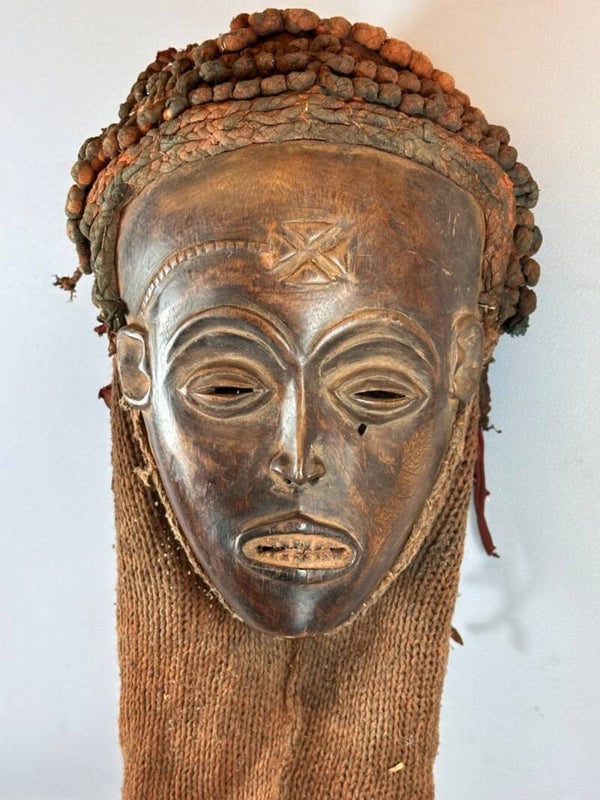 The Chokwe are members of a large cultural cluster that now lives in central Angola, parts of the Democratic Republic of Congo and Zambia. This cluster consists of a number of different but related peoples, the most prominent of which are the Chokwe, but the cluster also includes the Lunda, Ovimbundu, Lwena, Luvala, Mbwela and Imbangala. As a result of the complex interaction between people, the region has shared stylistic elements and figurative forms based on shared mythologies and ritual practices. The current mask called Mwana pwo depicts a beautiful young woman and represents the female ancestor. Mwana pwo mask appears at the initiation and circumcision ceremonies of young boys (Mukanda). Mwana Pwo also dances at the induction of a new chief, at funerals and fertility rituals, and during public entertainment. During the performance, Mwana Pwo is always accompanied by male character masks such as Cihongo or Cikunza. Mwana Pwo's dancer attracts a very large audience, especially women. The grace and elegant gestures of the pwo mask teach Chokwe women to act gracefully. Mwana Pwo reflects all the positive qualities of an ideal woman who can serve as a Chokwe role model.