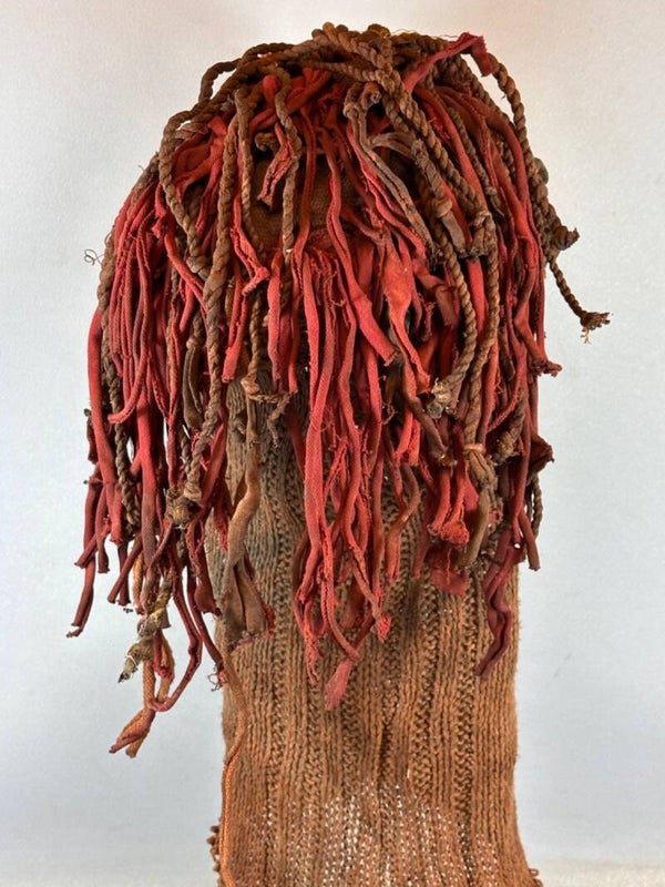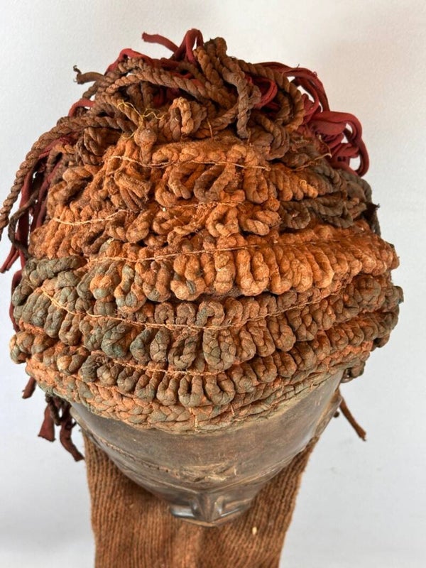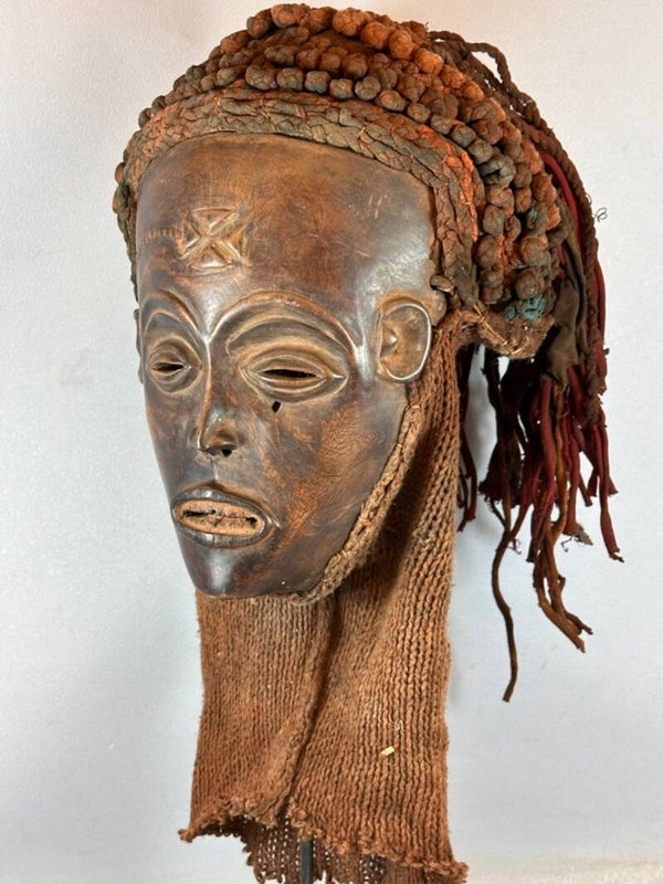 The face is brown in color with a smooth surface. The mouth is slightly open. The hair is made of cords, the net is made of textile fibers.This mask comes from the Chokwe people. It belongs to the famous category known as Mwana pwo and was performed during the ceremonies of circumcision and initiation of young boys. The headdress attached to the mask is well preserved. The face shows typical Chokwe carving patterns and expression.