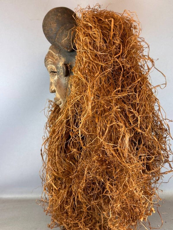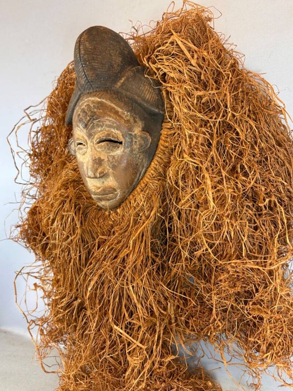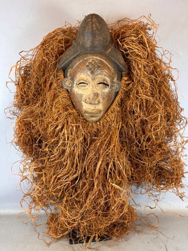 PUNU mask (pronounced pounou) from Okuyi dance. The Punu are a 'Bantu' people from Central Africa, mainly located in the south of Gabon. Social cohesion is ensured by the 'Moukanji' society, whose essential role is to subdue the evil spirits of the forest. The eyes in fine curved palpebral slits. This striped hairstyle, combined with side quilts, represents the braided braids of Punu women. The face is powdered with white kaolin "itengi" (white clay mixed with powder from broken bones of the deceased), due to his age he still has a little left. Color of mourning, which links to the world of spirits and ancestors.