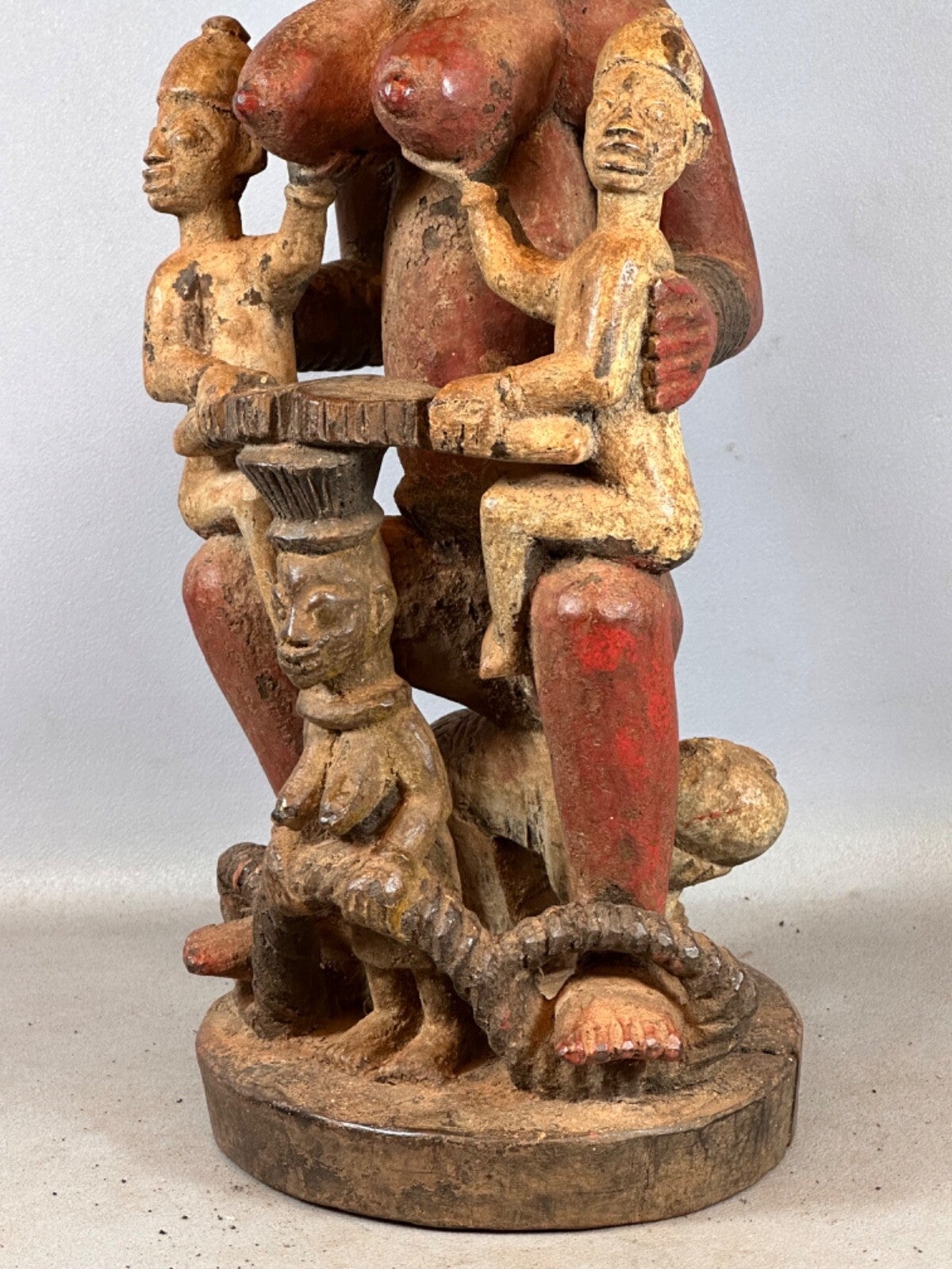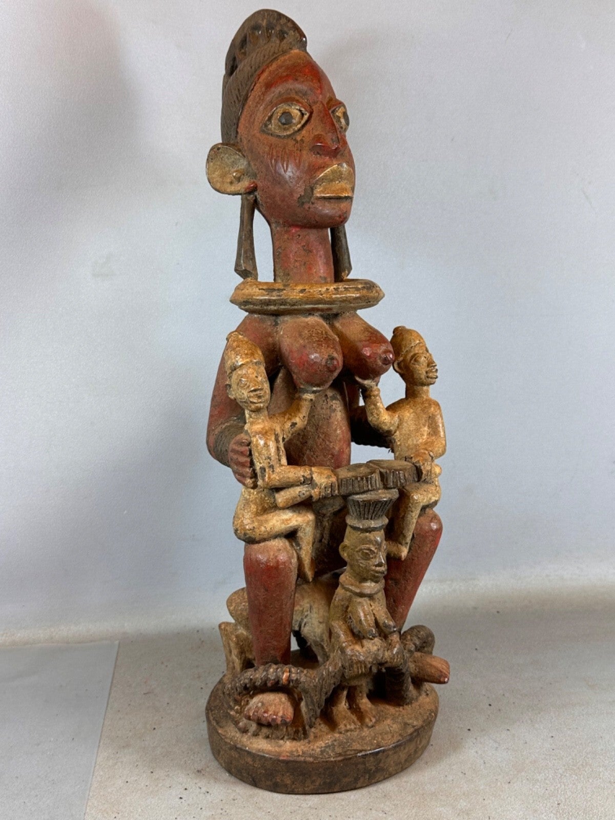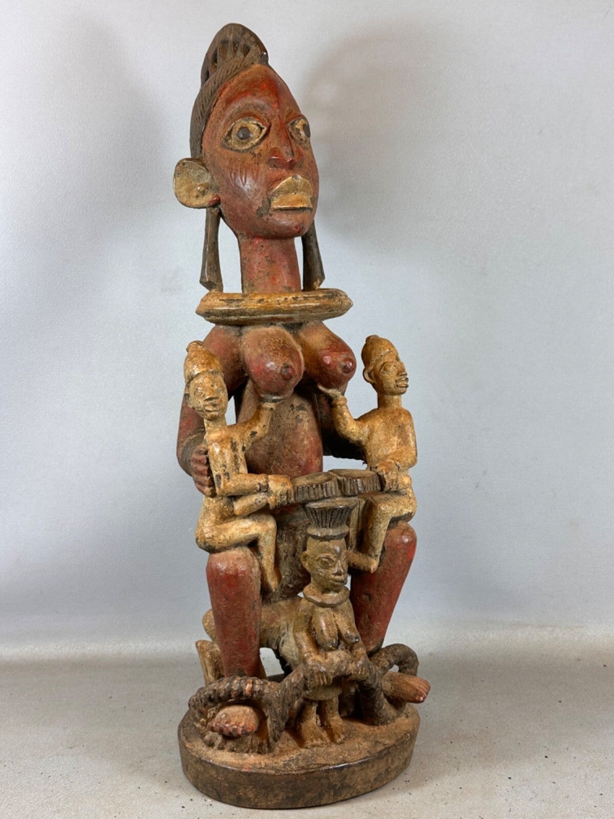 This impressive and truly beautifully carved shrine statue, like most other types of Yoruba sculpture, is generally naturalistic. This statue depicts a woman with several children gathered around her, who express fertility and will later care for her in her old age. True to the classic Yoruba form, with a beautiful hair comb, springs, and facial markings, her eyes and disproportionate eyelids project from her oval face, giving the figure a spiritual intensity, enhanced by her stiff and tight lips.