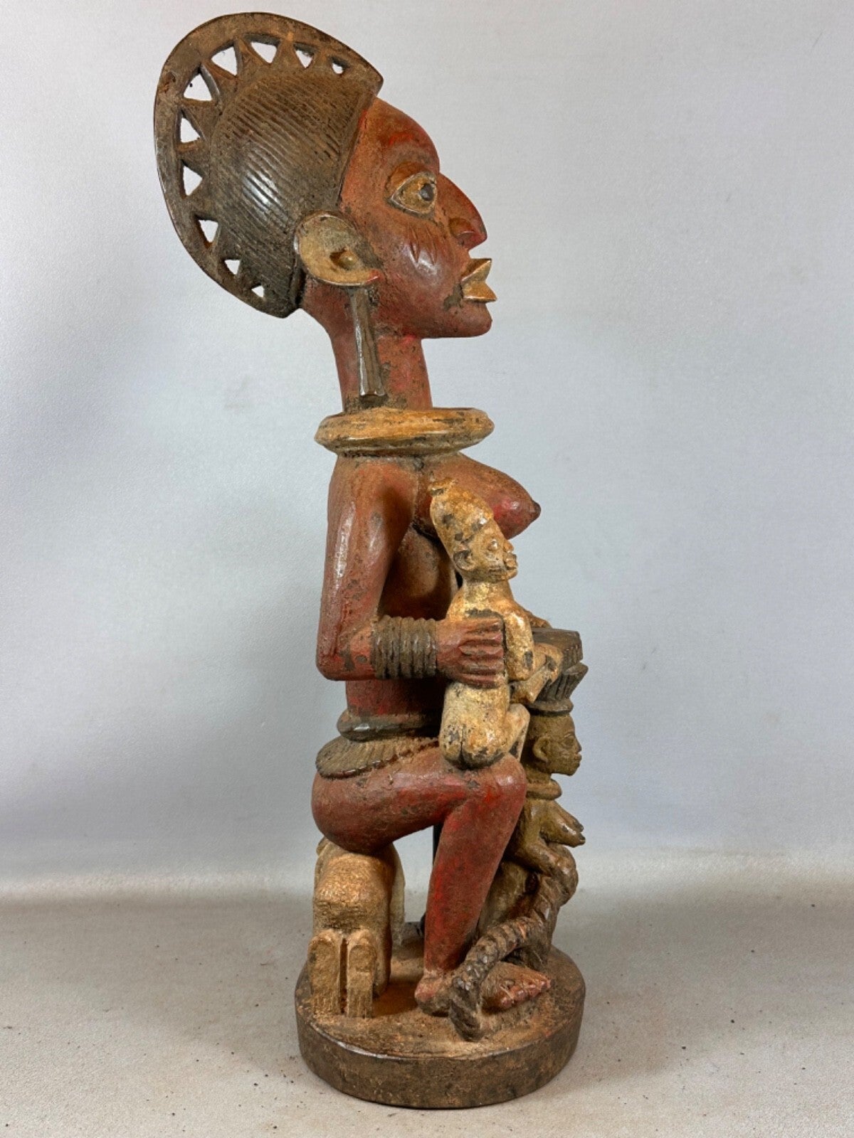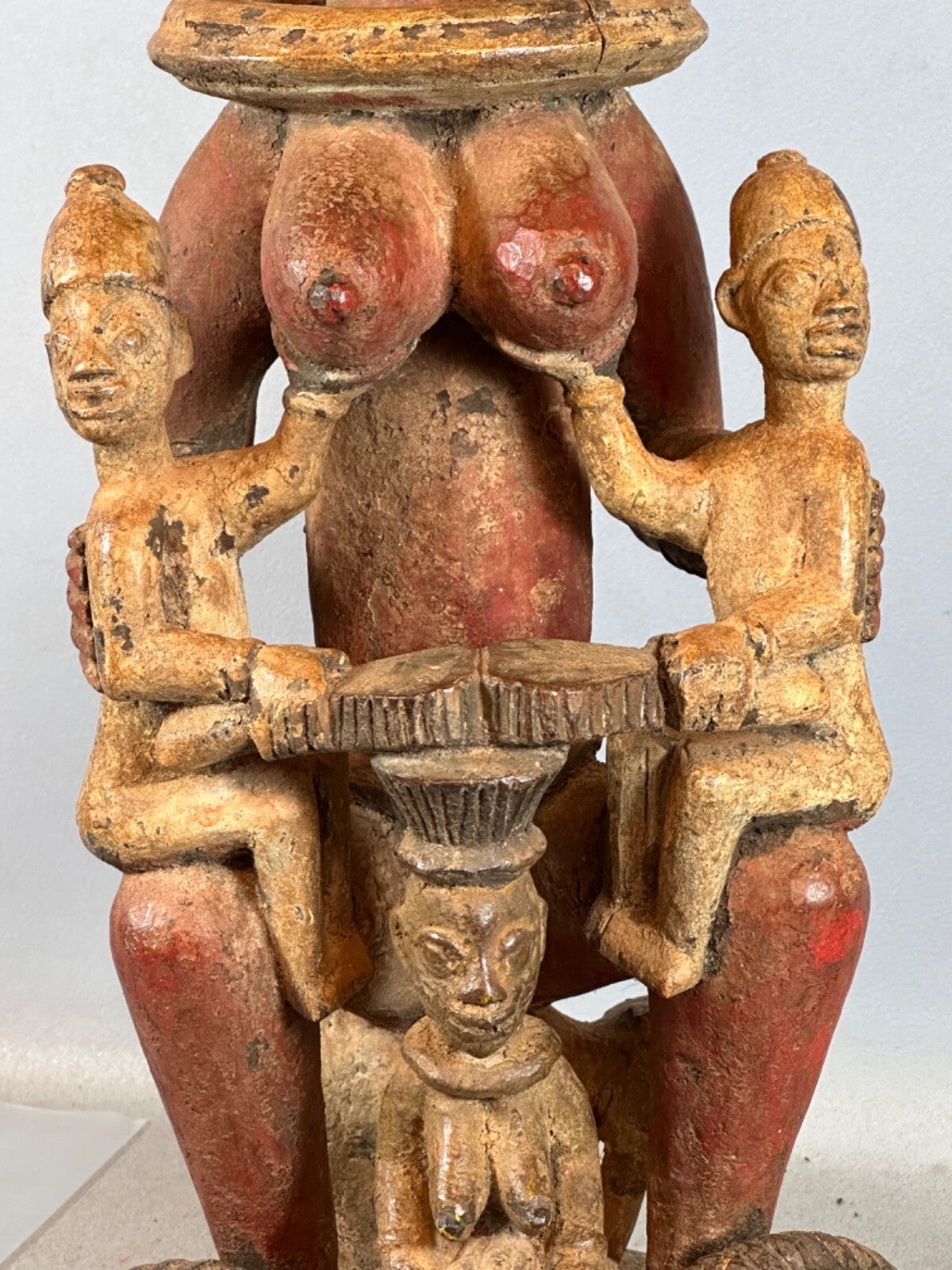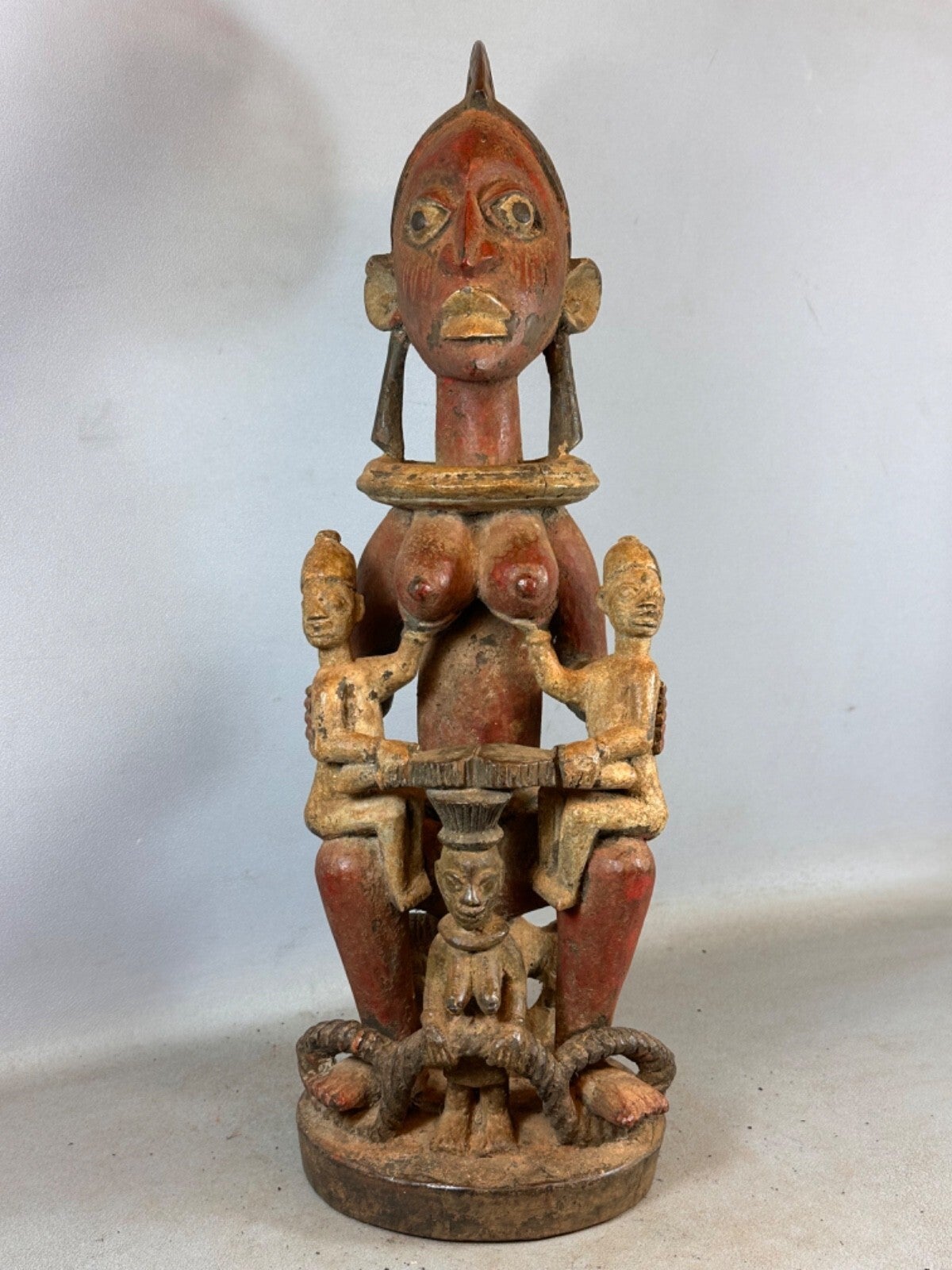 This impressive and truly beautifully carved shrine statue, like most other types of Yoruba sculpture, is generally naturalistic. This statue depicts a woman with several children gathered around her, who express fertility and will later care for her in her old age. True to the classic Yoruba form, with a beautiful hair comb, springs, and facial markings, her eyes and disproportionate eyelids project from her oval face, giving the figure a spiritual intensity, enhanced by her stiff and tight lips.