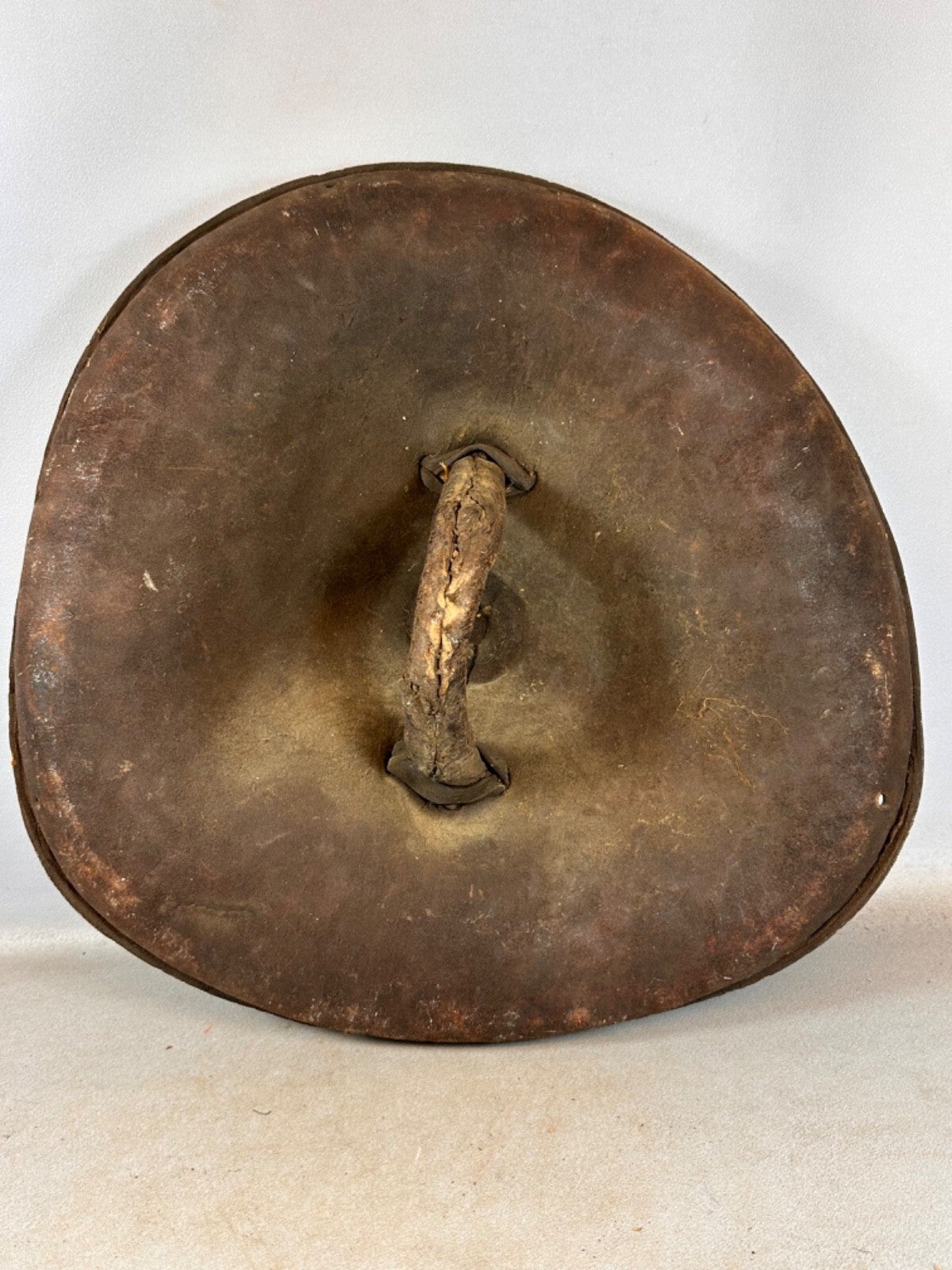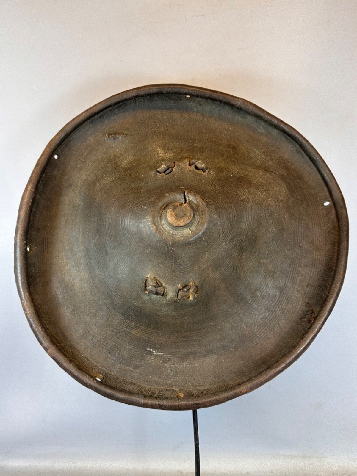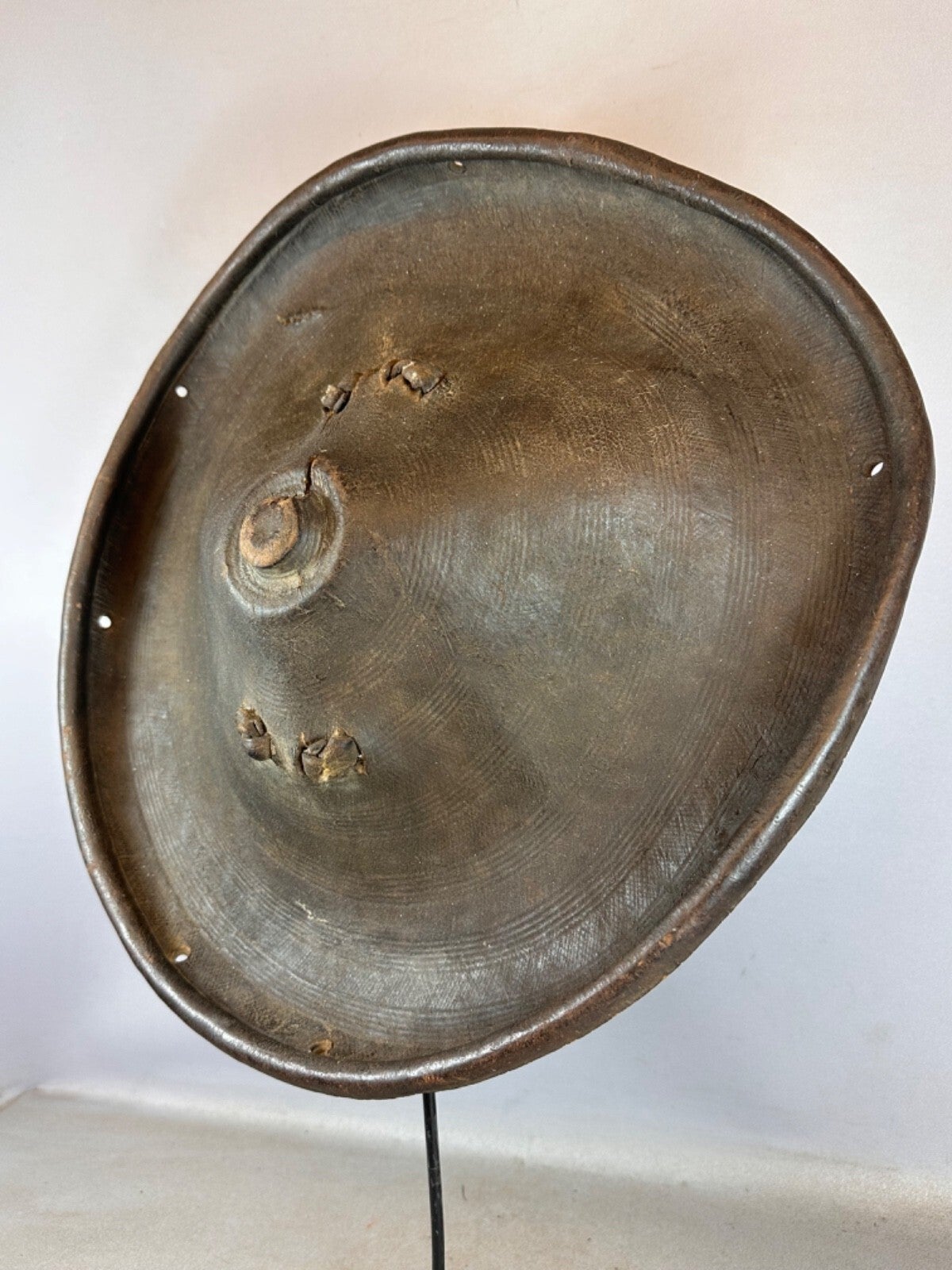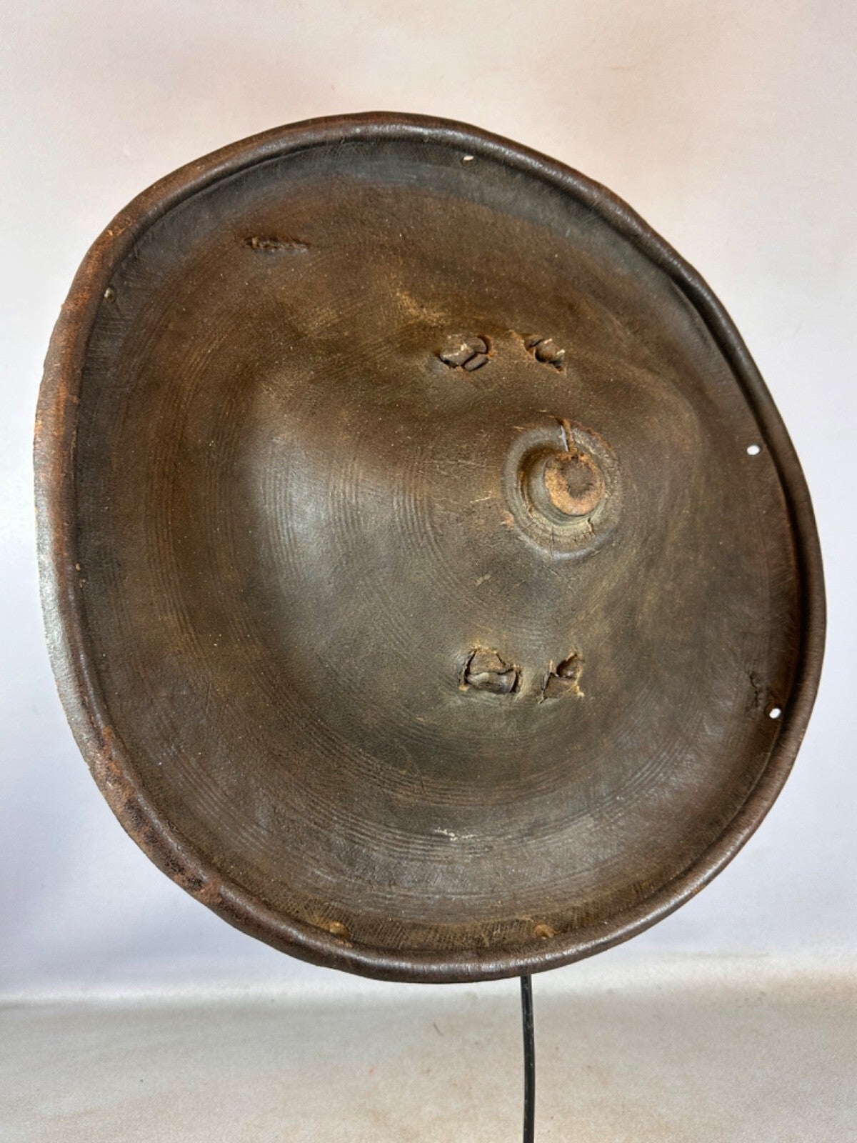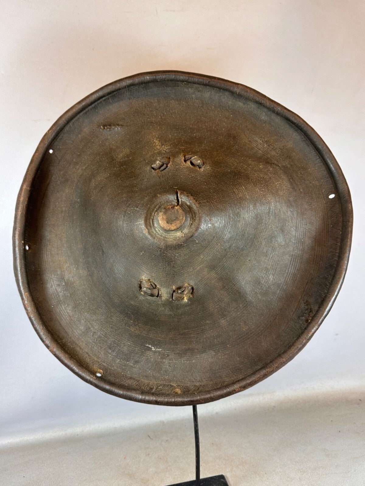 A large rounded Ethiopian shield made out of leather that could be attributed to various Ethiopian warrior groups. Ethiopian shields come in variety of designs and decorations (beads, silver strips etc.). They are made of various media that include, wood, metal, vegetable fiber (rattan or raffia).