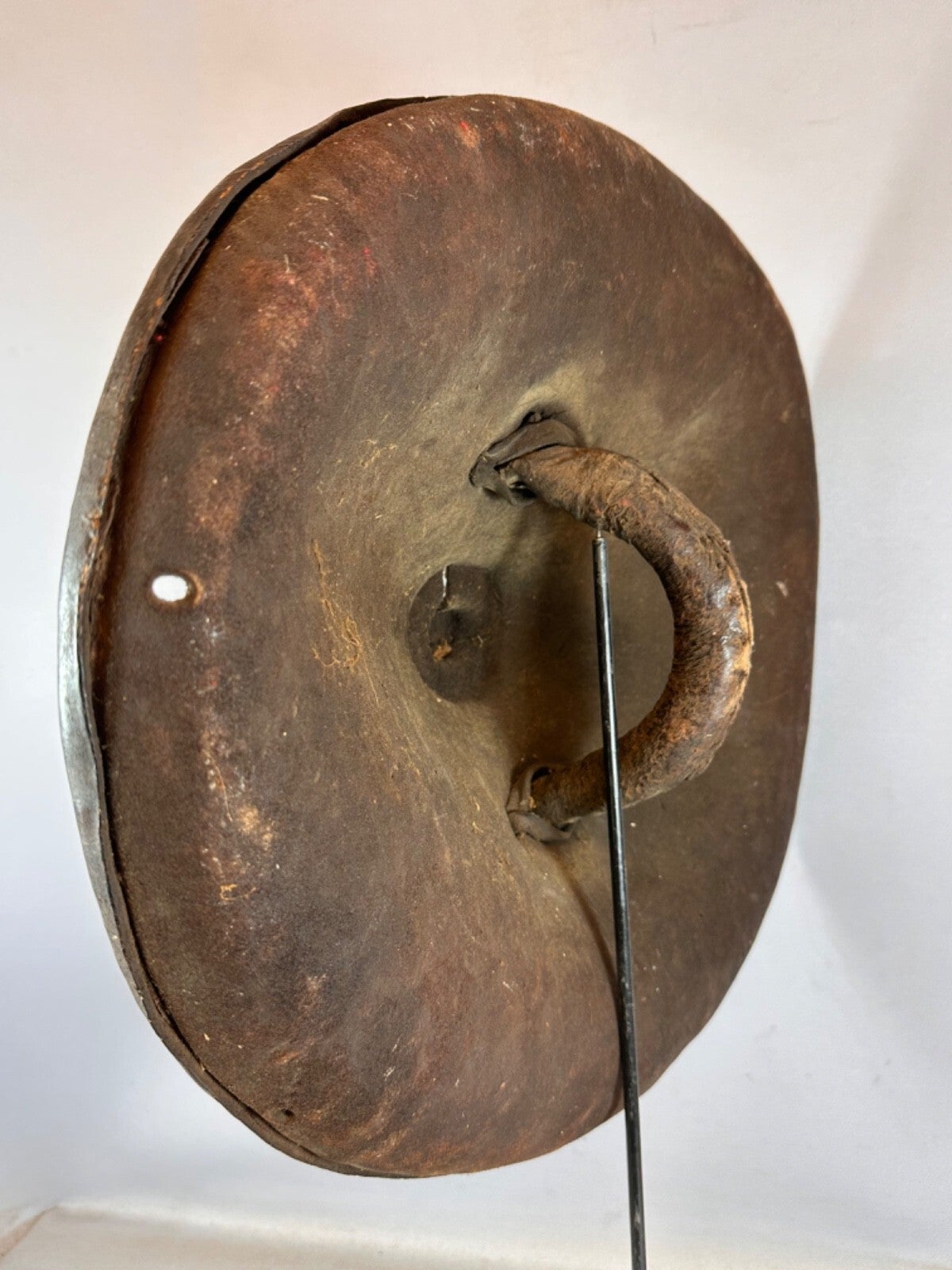 Leather is preferable for the hide is strong and resistant. The visual effect, the functionality and practical purposes of the piece dictated the form a shield should take. A good shield should offer a maximum of protection. The material used should be strength and durable. Almost all peoples of Africa made usage of the shield. In many cultures, shields like this were known as a defensive weapon, used by the warriors during combat. Shields were also displayed as emblems of status or rank and also as accessories of dance during festival or commemorative ceremonies or after a victory.