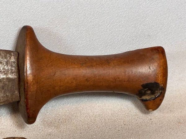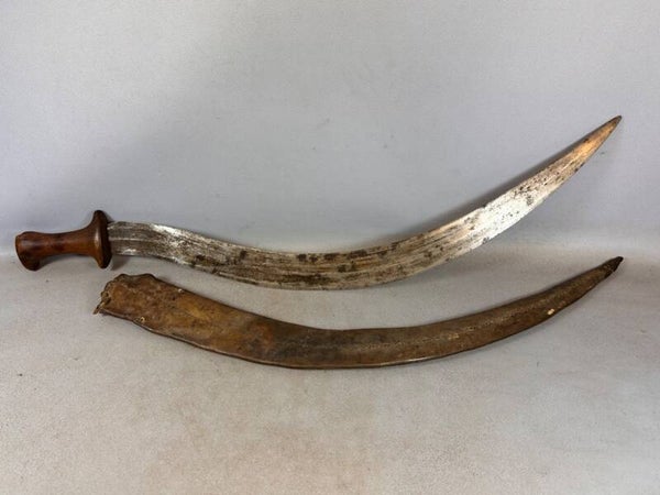 Our example dating to around 1850 has a 29" blade, sharpened on BOTH sides mounted onto a wooden hilt. The sword comes complete with its original leather scabbard.
