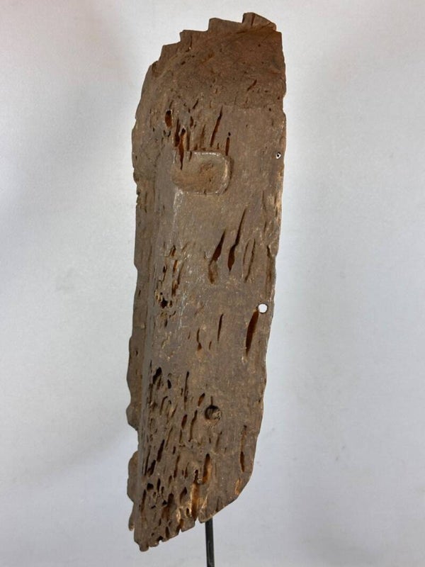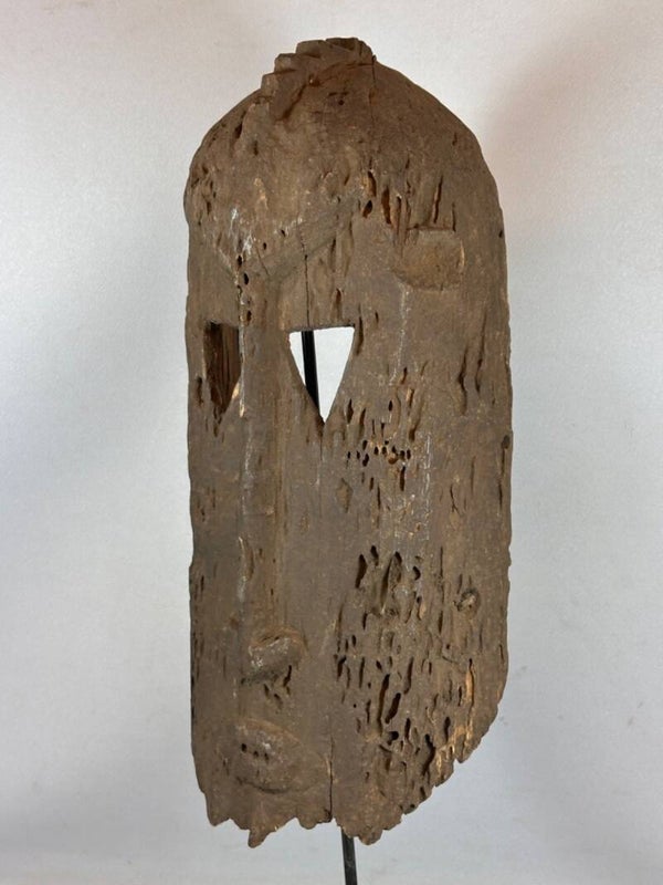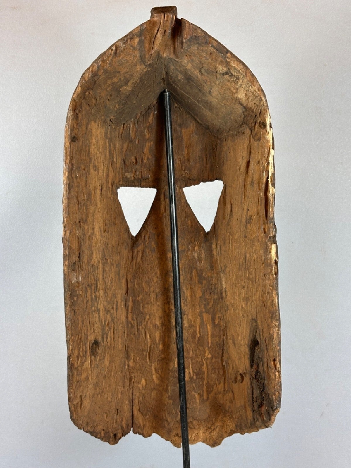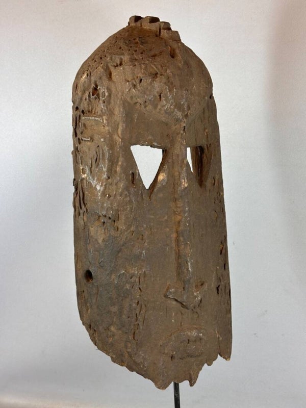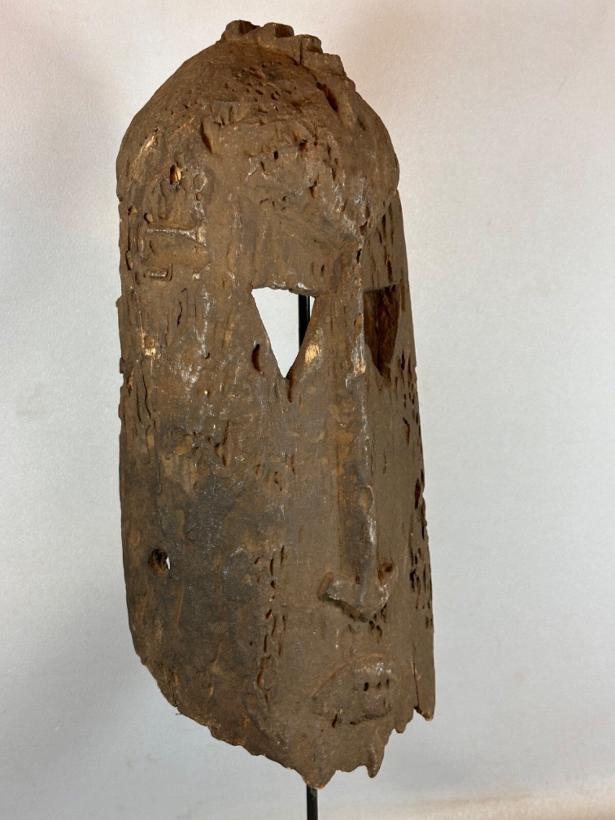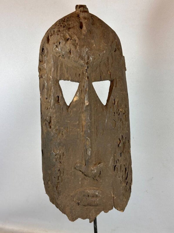 A Dogon mask depicting an abstracted human face showing traces of exposure to the elements on the surface .