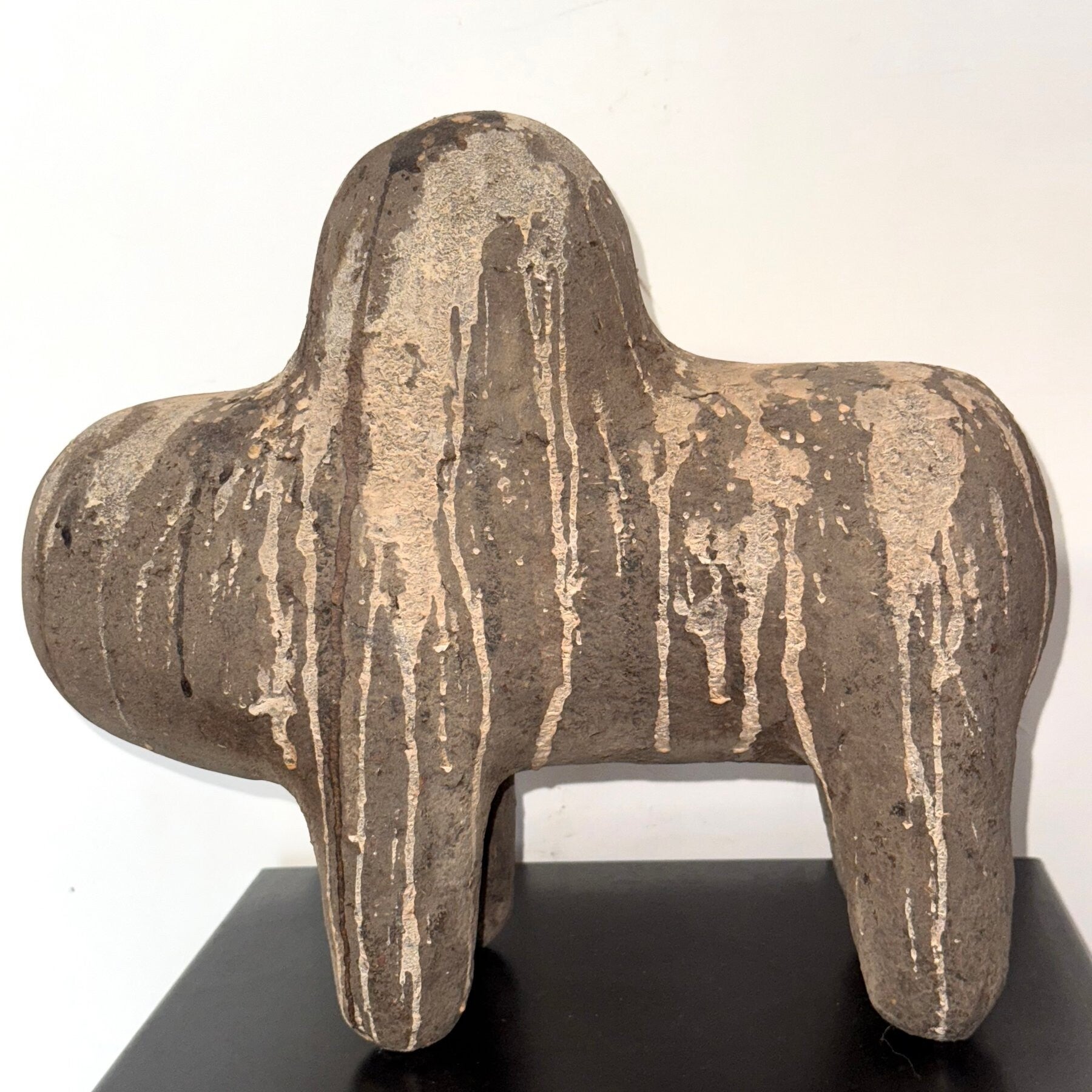 The creature a boli represents is not clearly identifiable, but it is usually assumed to be a buffalo or zebu. The boliw have attracted considerable attention from Western observers because of their amorphous shapes and unusual materials. This spherical, amorphous form is a rather unique characteristic of the Bamana art repertoire. Boliw consist of a wooden "core" frame, wrapped in white cotton cloth, around which clay and sacrificial materials are incorporated. This boli has four short "legs" on which it rests, and a single hump rising from the top.