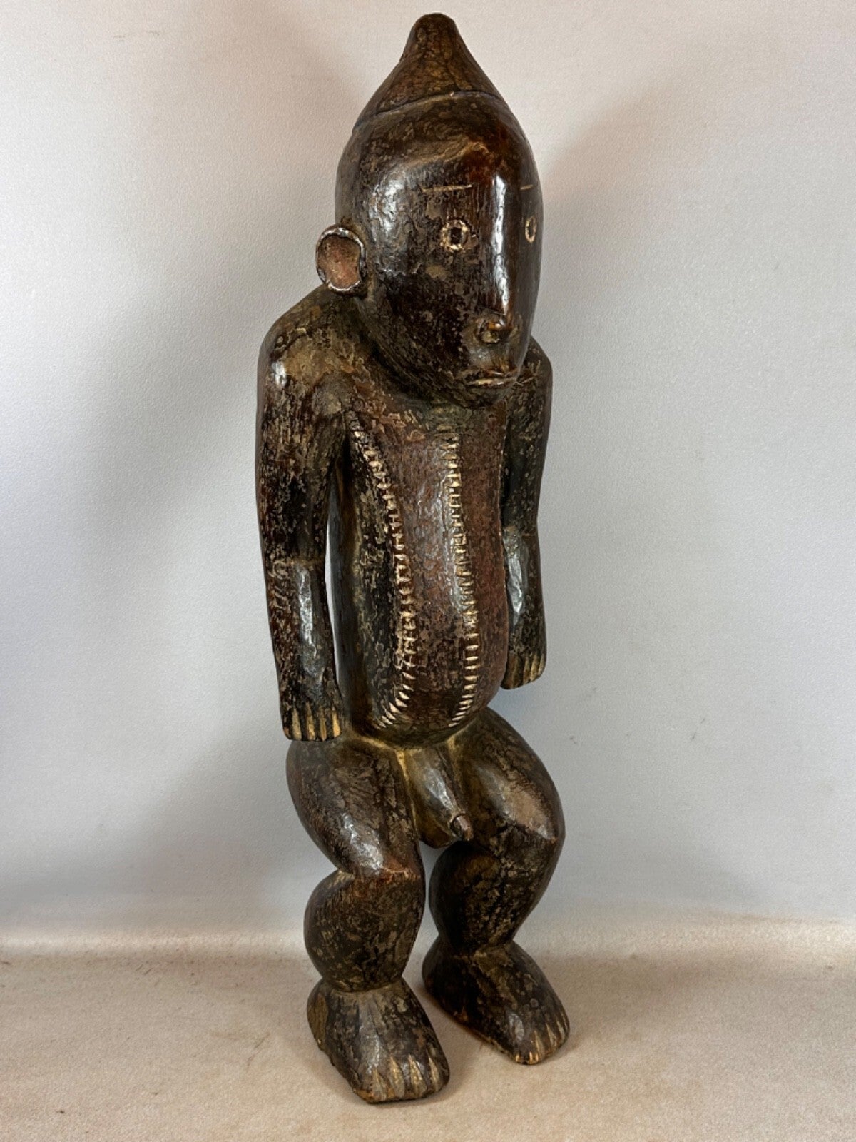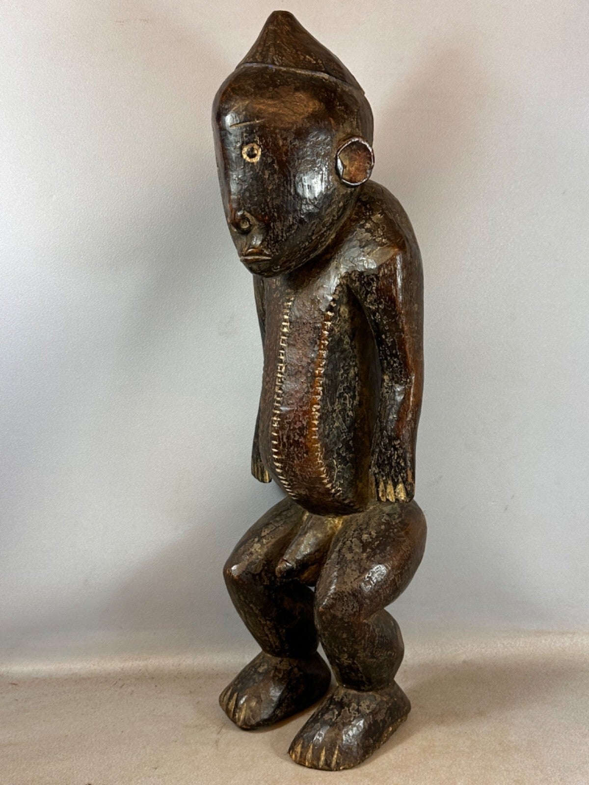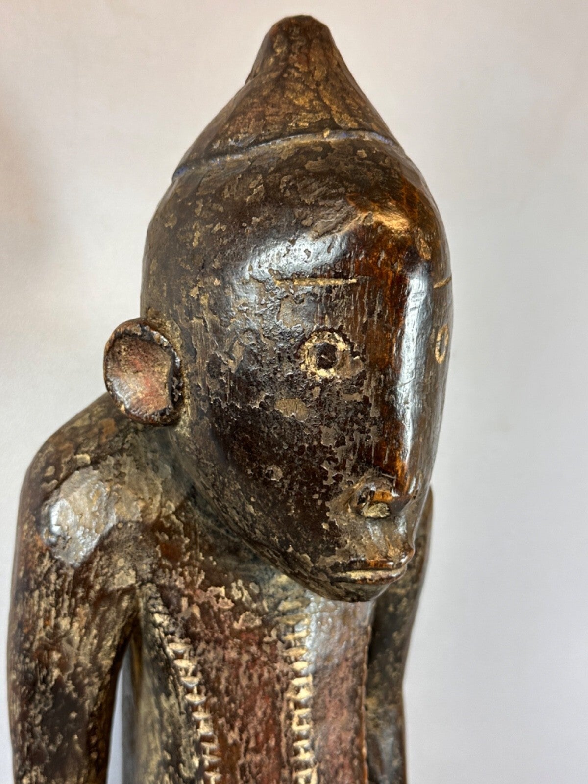 Perfect proportions for this exceptional male sculpture, which depicts a Tiv ancestor in a monkey pose representing holiness, with three vertical lines with white indentations across his entire body.