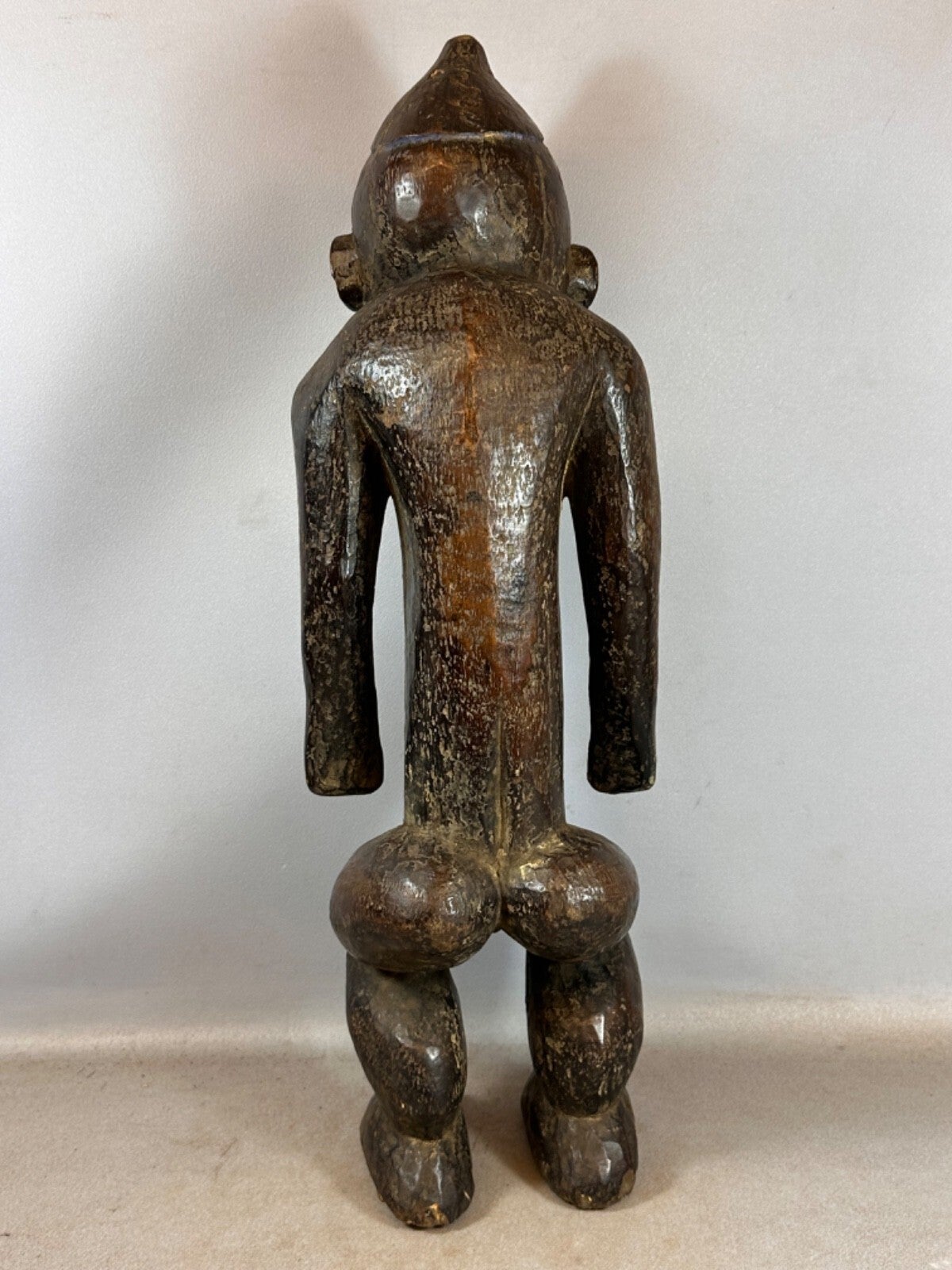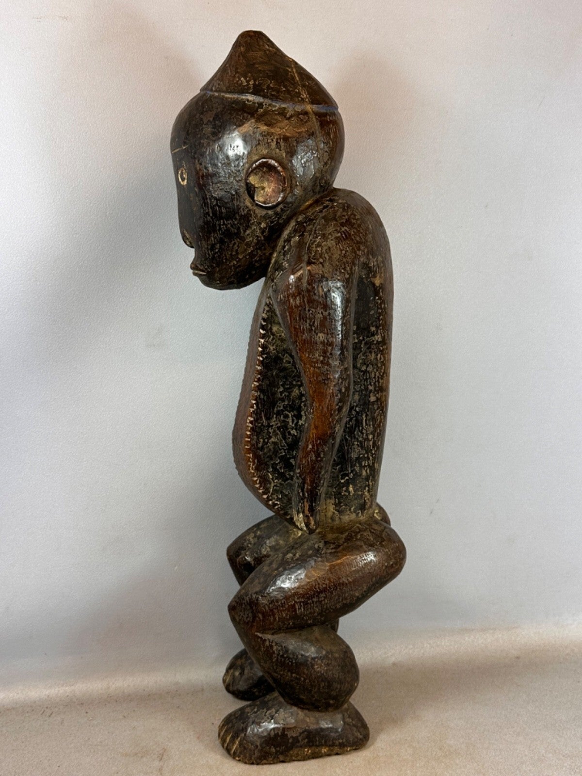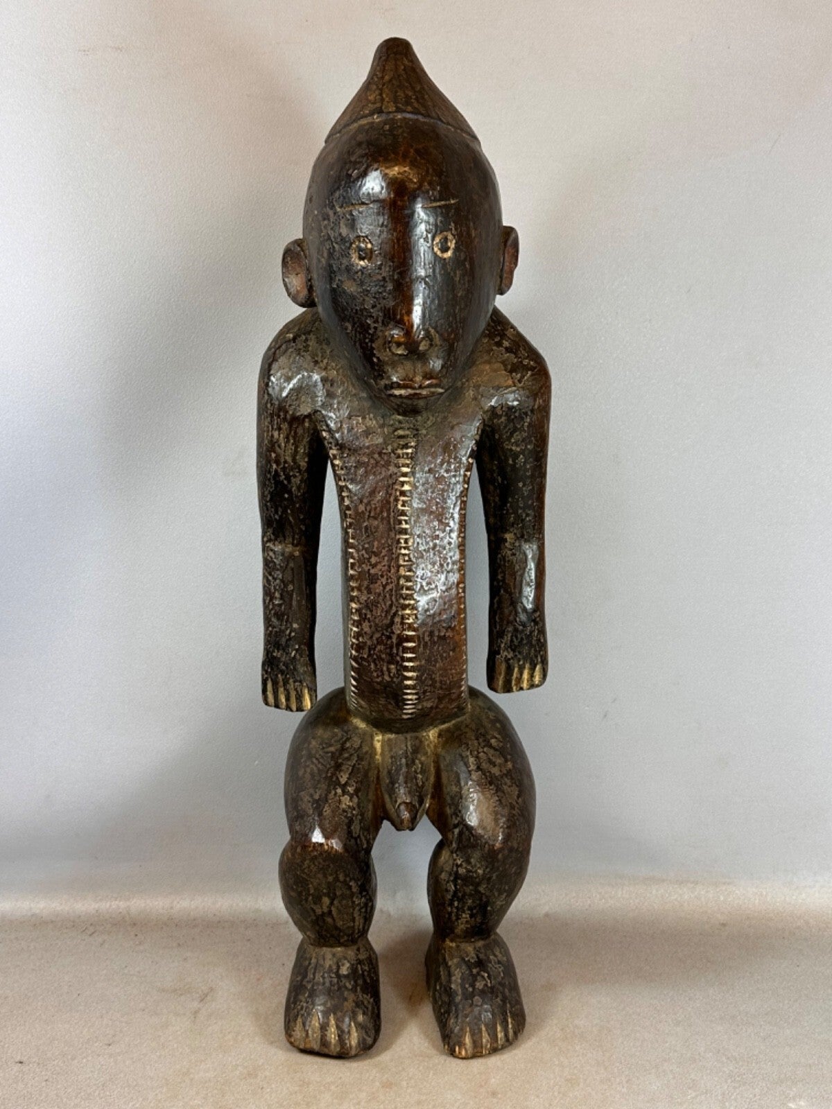 Perfect proportions for this exceptional male sculpture, which depicts a Tiv ancestor in a monkey pose representing holiness, with three vertical lines with white indentations across his entire body.