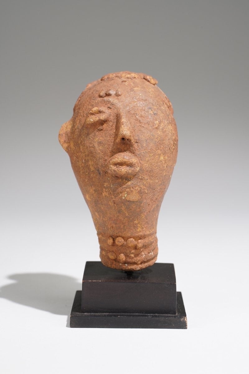 The Akan terracotta head from Ghana represents a significant object of commemorative and ritual function within Akan cultural practices, particularly among the Asante and related subgroups. Such heads were often created as part of funeral customs to honor and memorialize deceased individuals of high social standing, including royals and ancestors. These objects are typically modeled with a high degree of abstraction and stylization, featuring prominent facial features such as arched eyebrows, almond-shaped eyes, and elaborate coiffures or headdresses, which are indicative of status and identity.