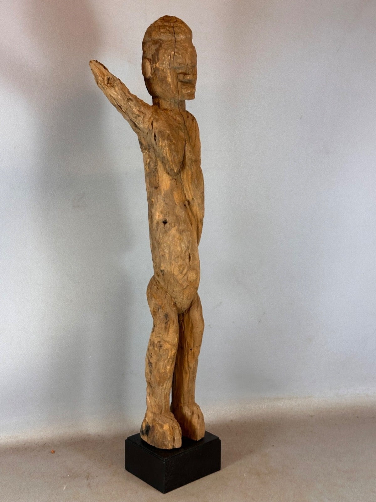 A male Lobi Bateba statue, collected in the Gaoua region, Burkina Faso, standing on a round base, straight legs protruding from it, hands resting at the waist, protruding belly, a large oval-shaped head resting on narrow shoulders, roughly carved features of a small mouth, pointed nose and large, protruding coffee bean eyes, large ears on the sides of the face. Signs of age and use. Certificate of origin and provenance.