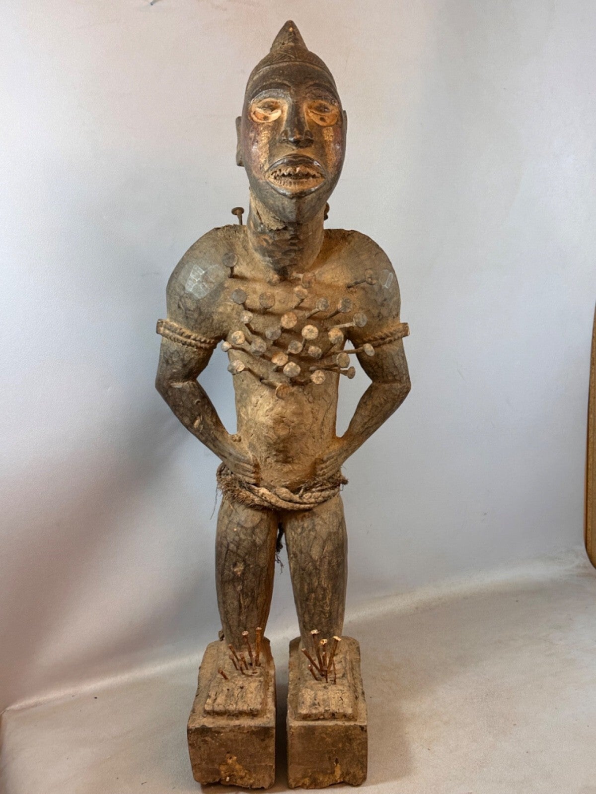 OLD, RARE & LARGE Expressive African Nkisi Nkondi statue with glass eyes from the Bakongo, Congo.