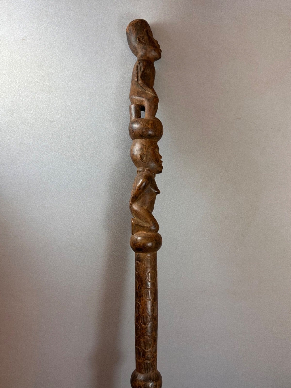 A very rare wooden Yombe Mwaala staff with three spherical elements. Between the spherical elements, curves with vertical stripes are carved. At the top is a finely carved seated male figure, speaking law. Below, a shackled female figure.