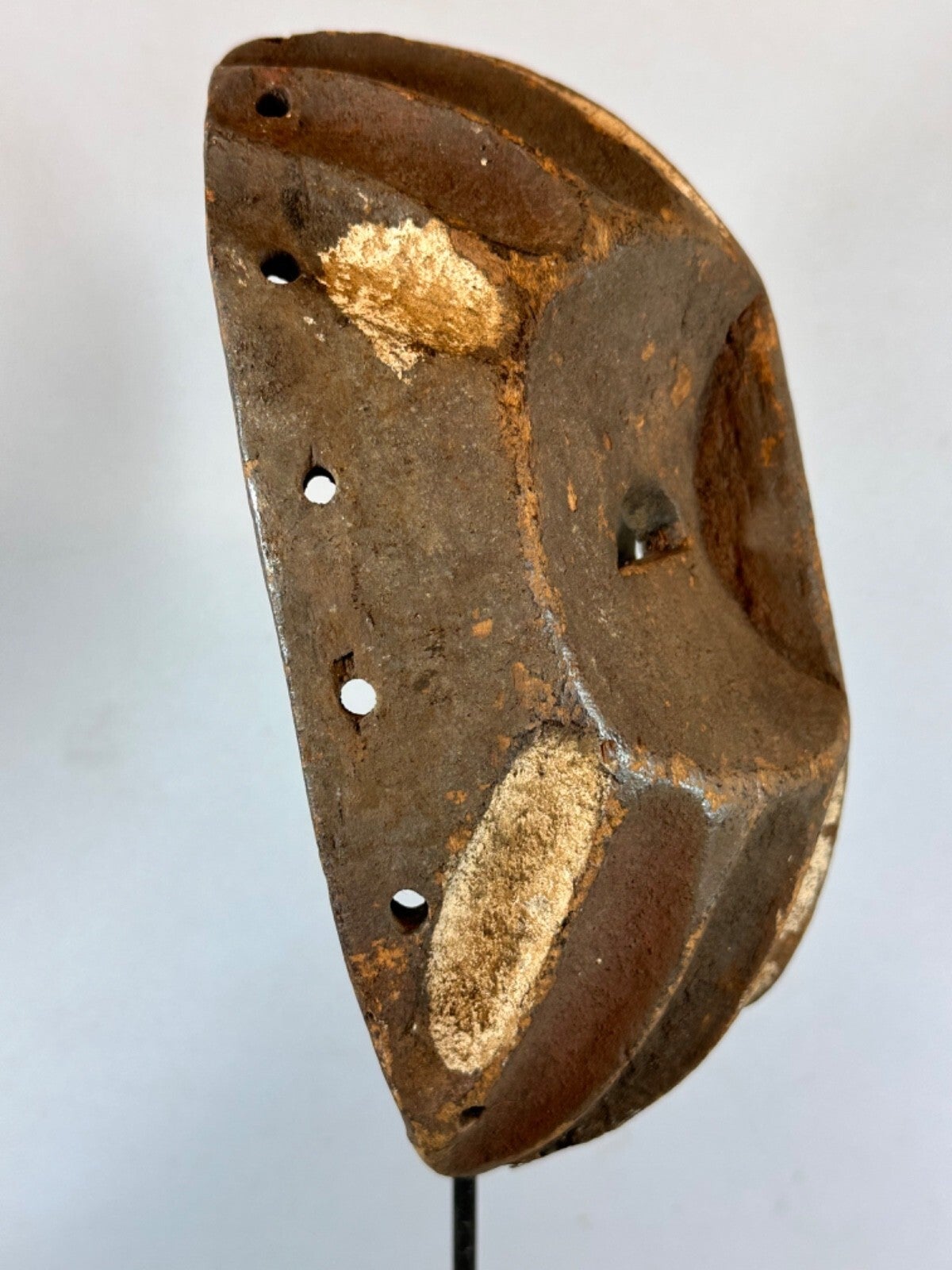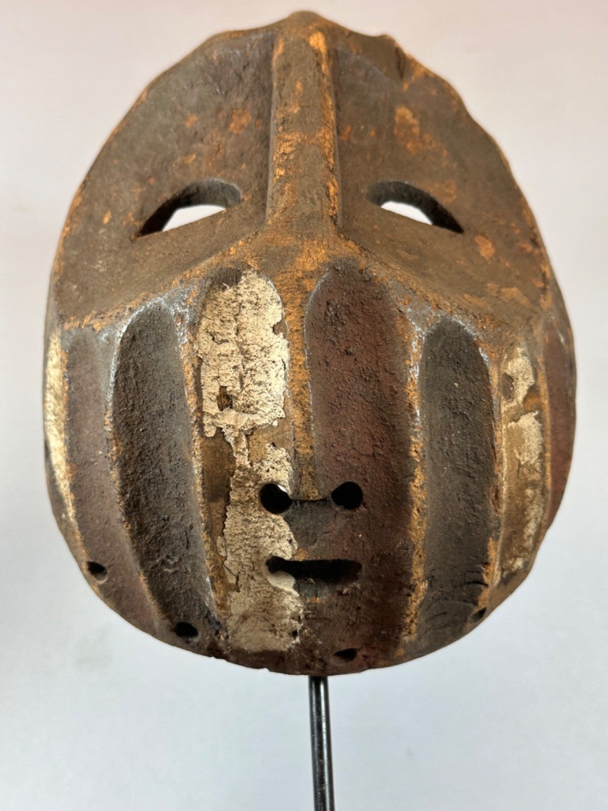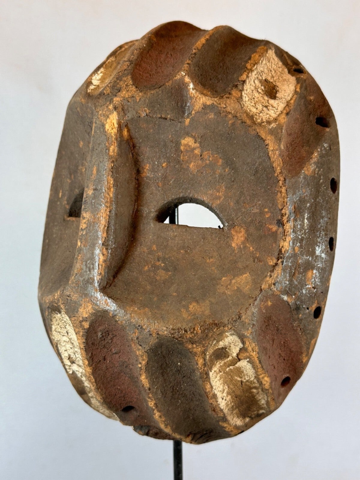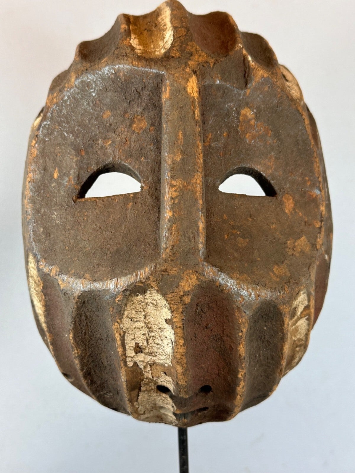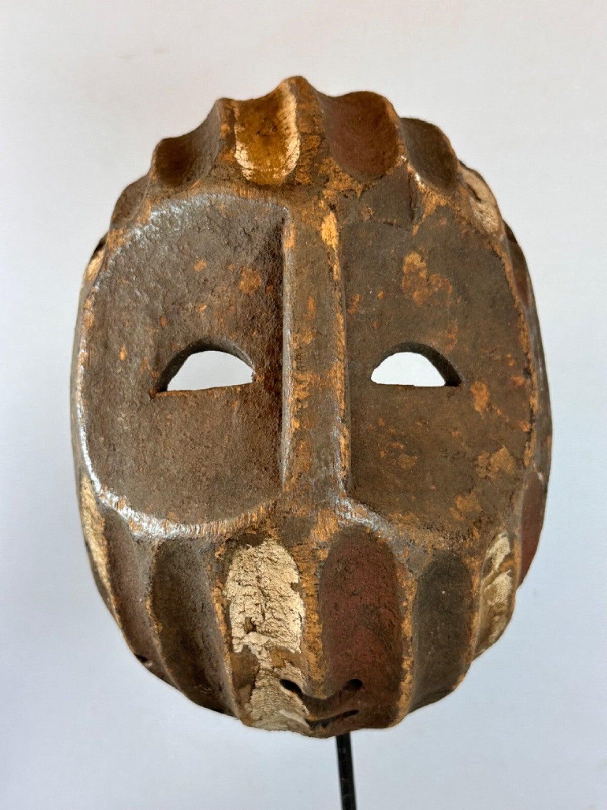 This almost flat African mask stands out for its naive appearance. Of Mbole or Yela origin, two close African ethnic groups in the DR Congo, there are oblique streaks under the eyes. These highly stylized traditional masks intervened during initiation rituals of which little is known because they took place away from the village, in secrecy.