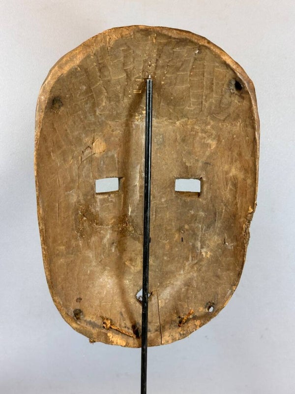 Some artwork can only be seen, handled or owned by the highest grades of the society. The objects are typically small and simple in form, and have a striking patina that derives from being handled or worn on the body. Iv. objects usually have russet or yellow patinas. The masks are fairly standardized, although the most important masks with special ritual use or symbolic meaning may have distinctive design. A typical mask will have a concave heart-shaped face. The forehead protrudes slightly, the nose is narrow, eyes are slits and the mouth is slightly open. Every time a mask is used it is rubbed with white clay, over time acquiring a white patina.