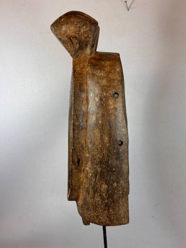 Made of wood, small and light, the rabbit mask is worn by young boys during an initiation dance depicting the confrontation between hunter and its prey, the rabbit, an agile and cunning animal. Like others, this mask also holds hidden meanings: among other things, it is believed to have healing properties for epilepsy.A Dogon mask depicting an abstracted human face showing traces of exposure to the elements on the surface .