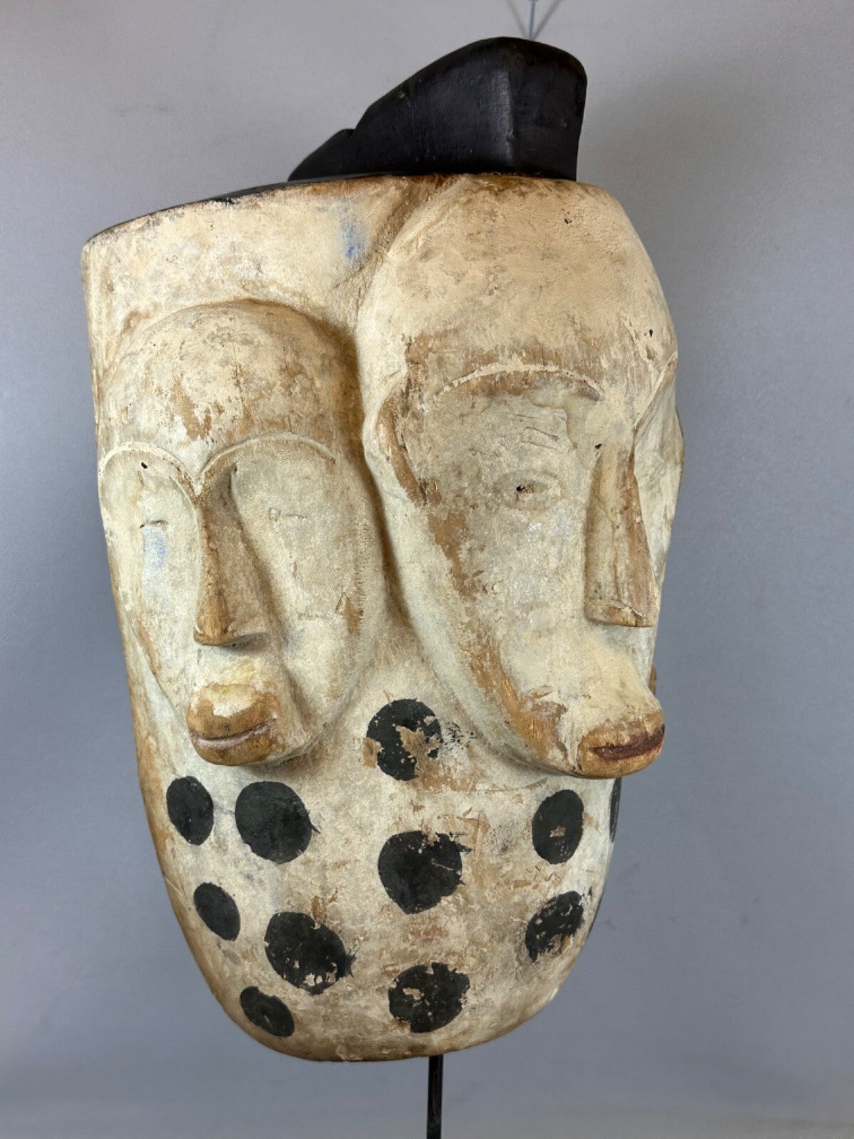 Multifaced masks (between two and six), like this one, consisting of three faces, existed and still exist among the Fang tribes (Bulu, Ntumu, Betsi, etc.) and Kwele, in northern Gabon, southern Cameroon, and Congo. They are called "Ngontang" by the Fang and "Ngontangang" by the Kwele. Both terms mean "young white woman." Dancing with this type of mask is said to protect against witchcraft. The underside is decorated with decorative black dots.