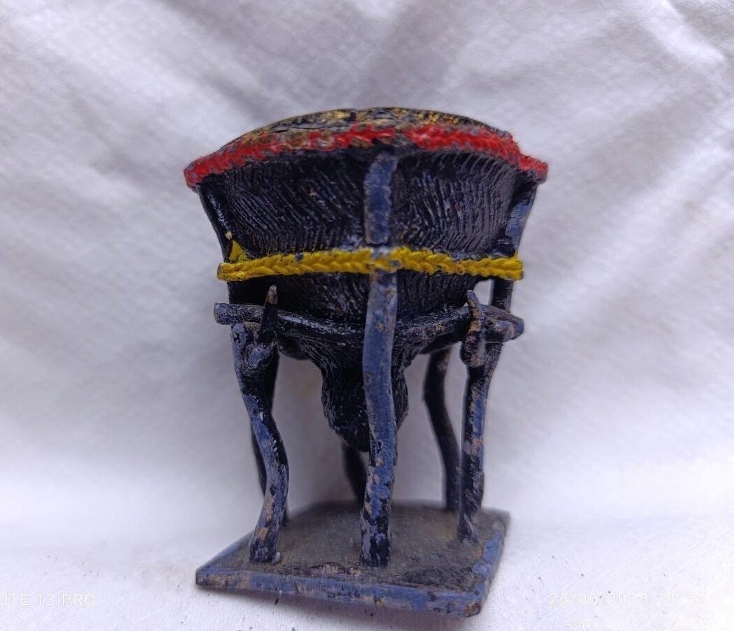 This solid bronze metal sculpture, used by a Mossi medicine man to blend medicinal herbs, depicts a stylized communal cauldron, a symbol of African wildlife and a powerful emblem of strength, vigilance, and kingship. It is handcrafted in Burkina Faso using the traditional lost-wax technique, widely used in West Africa.