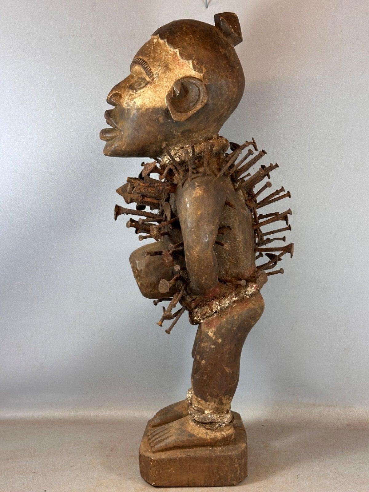 The protective power of this nail Nkisi Nkondi (the telema lwinbanganga posture adopted by the Kongo nobility and the soothsayers as a sign of absolute authority, eyes that would increase clairvoyance, knives and nails that recall the actions that sealed the history of the community, and traces of polychromy with therapeutic virtues) respond to the virtuosity of the sculptural gesture. The power of the streamlined face emphasizes the sensitivity of the facial features, through which the Kongo ideal of beauty is superbly translated: very finely modeled, fleshy mouth, slightly curved nose, shaded eyebrows, ears with detailed auricles. Stylistically, this statue is linked to the corpus of Vili sculptures.