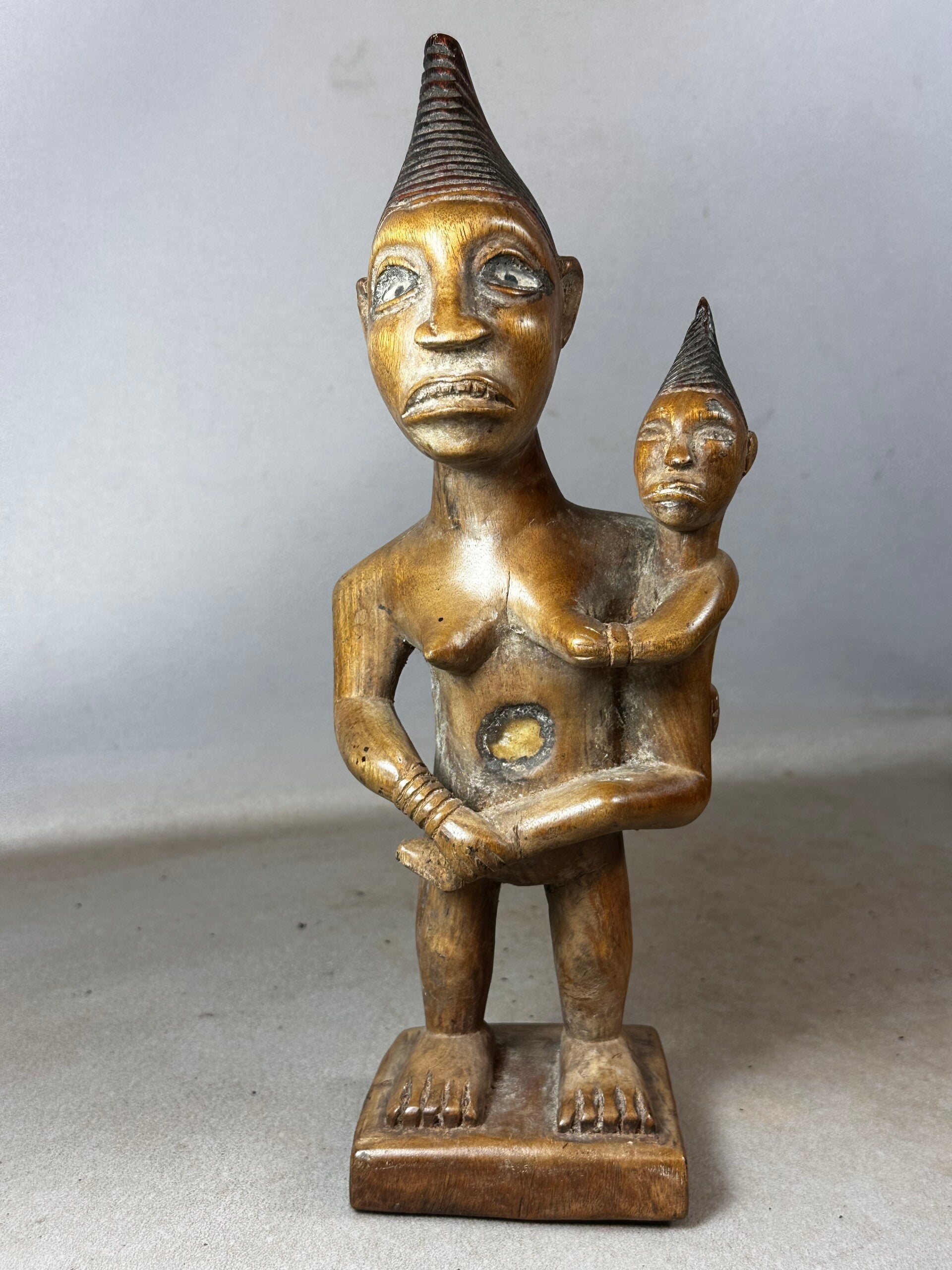 NTIQUE Finely crafted African sculpture from the Yombe with child, booth have glass eyes, Congo.