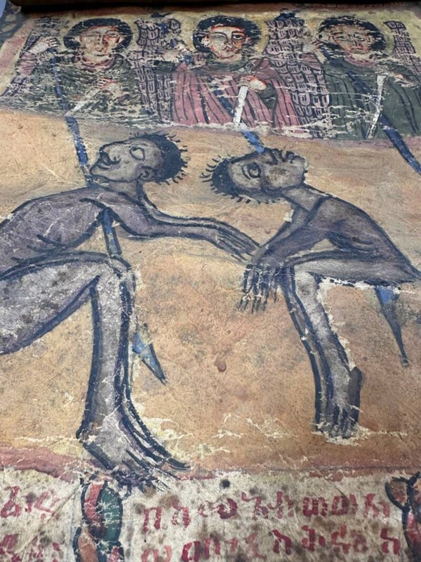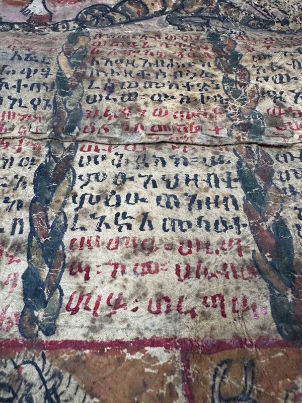 The scrolls are written in Geʽez, which has few remaining speakers, but is the official liturgical language of the Ethiopian Orthodox Church. To activate the scrolls, a third-party interpreter literate in Geʽez must read the scroll to the afflicted. The scrolls treat illness by extracting demons from the patient's body. They are commissioned by the patient from an unordained religious figure in the Ethiopian Orthodox Church known as a dabatara. Dabataras craft each scroll to the specialized needs of the patient seeking help, traditionally utilizing animal hide. The creation process involves a sacrificial ritual to obtain the hide, with the animal symbolizing the afflicted patron of the scroll.
