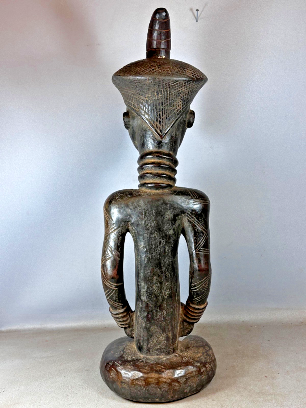 Dengese political power is in the hands of the Itoci, initiated men who at great expense acquire the right to wear insignia of rank. Dengese figures depict these dignitaries, who are identified by a plaited raffia-fiber hat with a raffia-covered wooden cylinder projecting from the top. The sculptures are conceived as half-figures, and the elongated torso terminates in a semicircular base that may actually represent stylized legs. The figures achieve a fair degree of naturalism through the depiction of the broad shoulders, muscular chest, and rounded torso and arms. The elaborate coiffure and cap, neck rings, and bracelets reflect the stylistic influence of their Kuba neighbors. This is particularly evident in the figure's swelling forehead, emphasized by the shaven angular hairline, and his broad facial features. The close association between the Dengese and the Kuba is further suggested by the figure's complicated geometric scarification patterns, which are reminiscent of decorative motifs found on Kuba cut-pile cloth and intricately incised wooden objects.