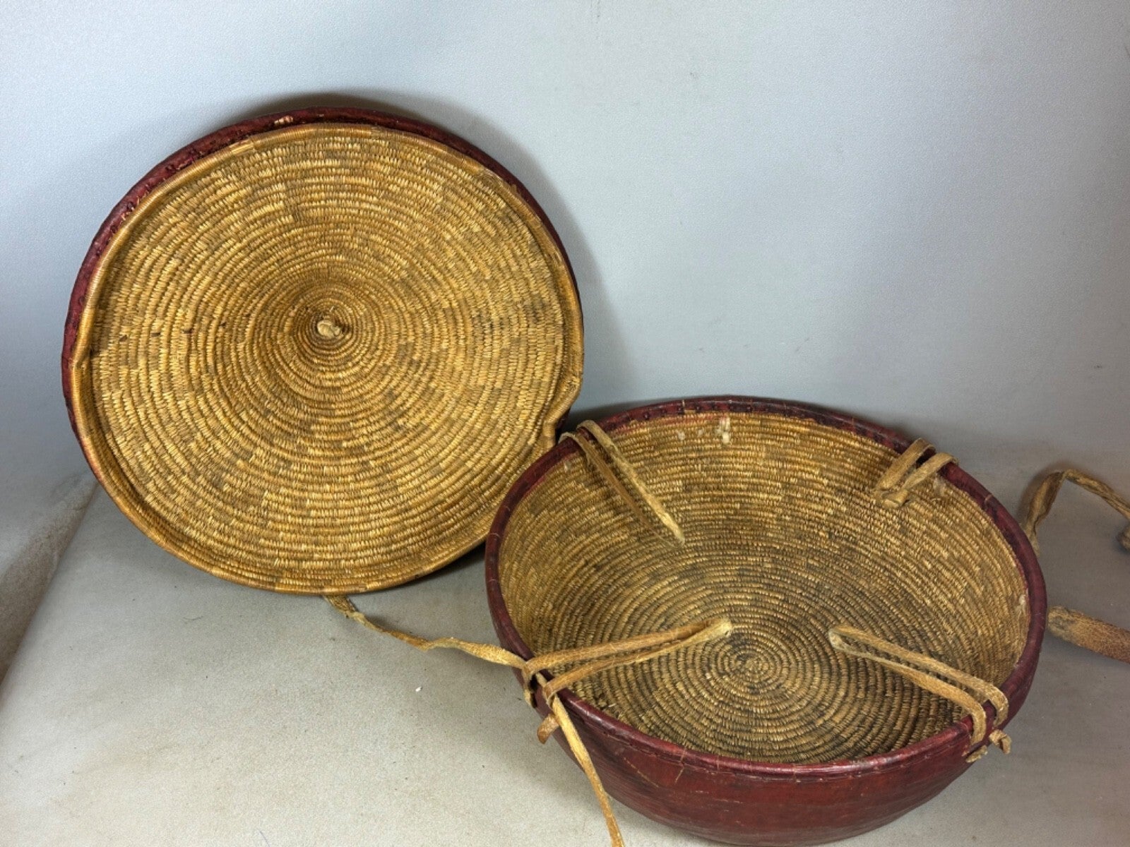 Originated from Ethiopia, these baskets were used to carry their national dish, injera bread, a sourdough-risen flat bread with a slightly spongy texture. The outer part of the basket is covered with leather while the inner part are woven beautifully with fibers. The lid is secured with a leather strap that is woven through long leather loops attached to the side of the basket.