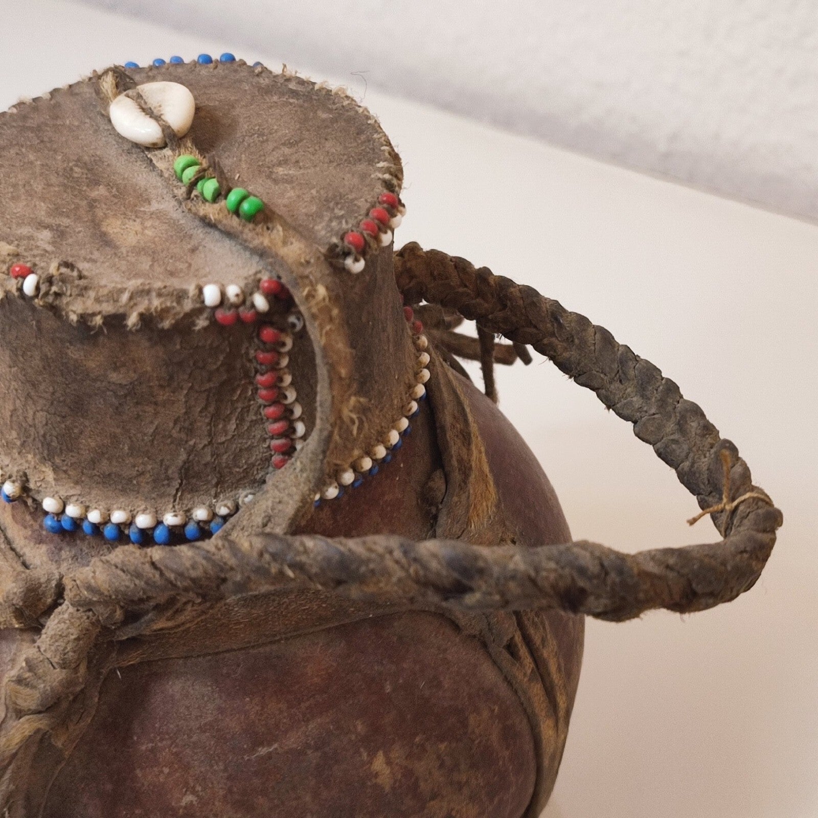 This is one of several types of basketry milk containers made and used by the Borana, a pastoral people who raise cattle in southern Ethiopia. The vegetal fibers used in their fabrication are woven very tightly, they are light and extremely durable, and serve as the ideal container for liquids. One of the key characteristics of the gorfa is the application of cowries, small white shells that enhance the beauty of the container. Among the Borana, all women are expected to learn to make woven milk containers like the gorfa.