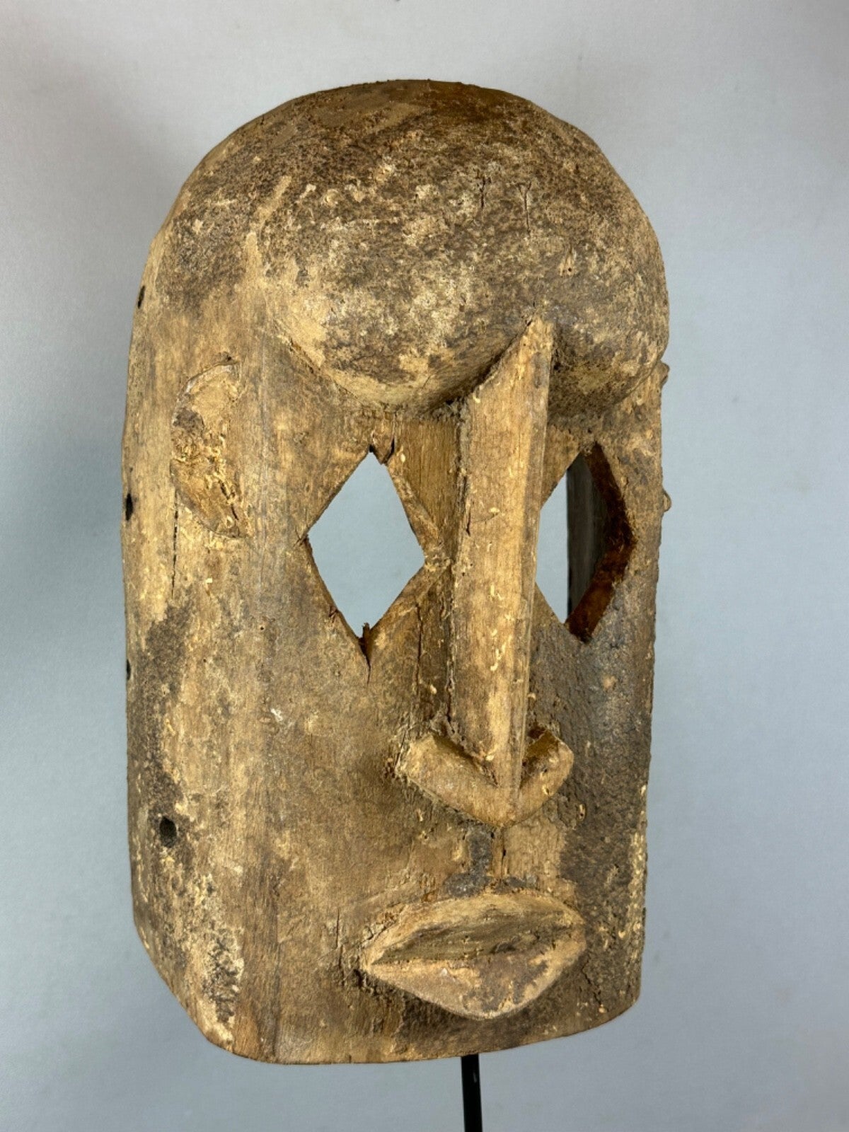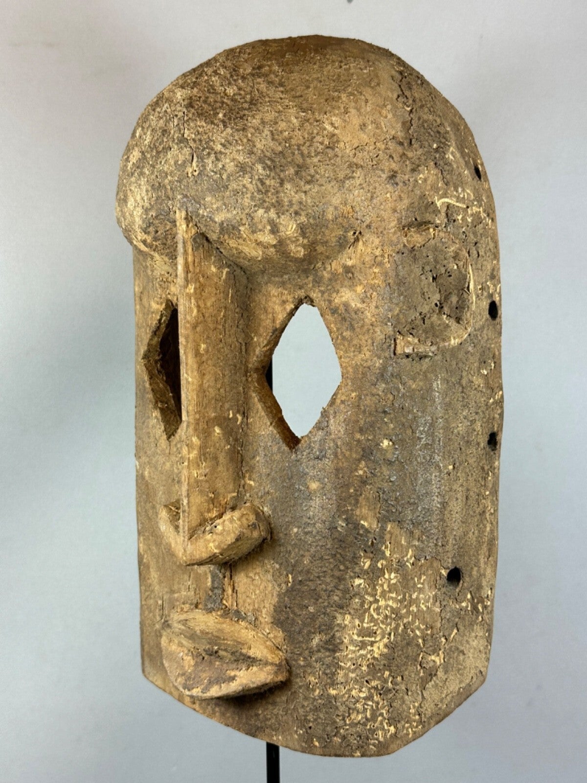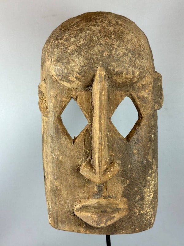 A Dogon mask depicting an abstracted human face showing traces of exposure to the elements on the surface .