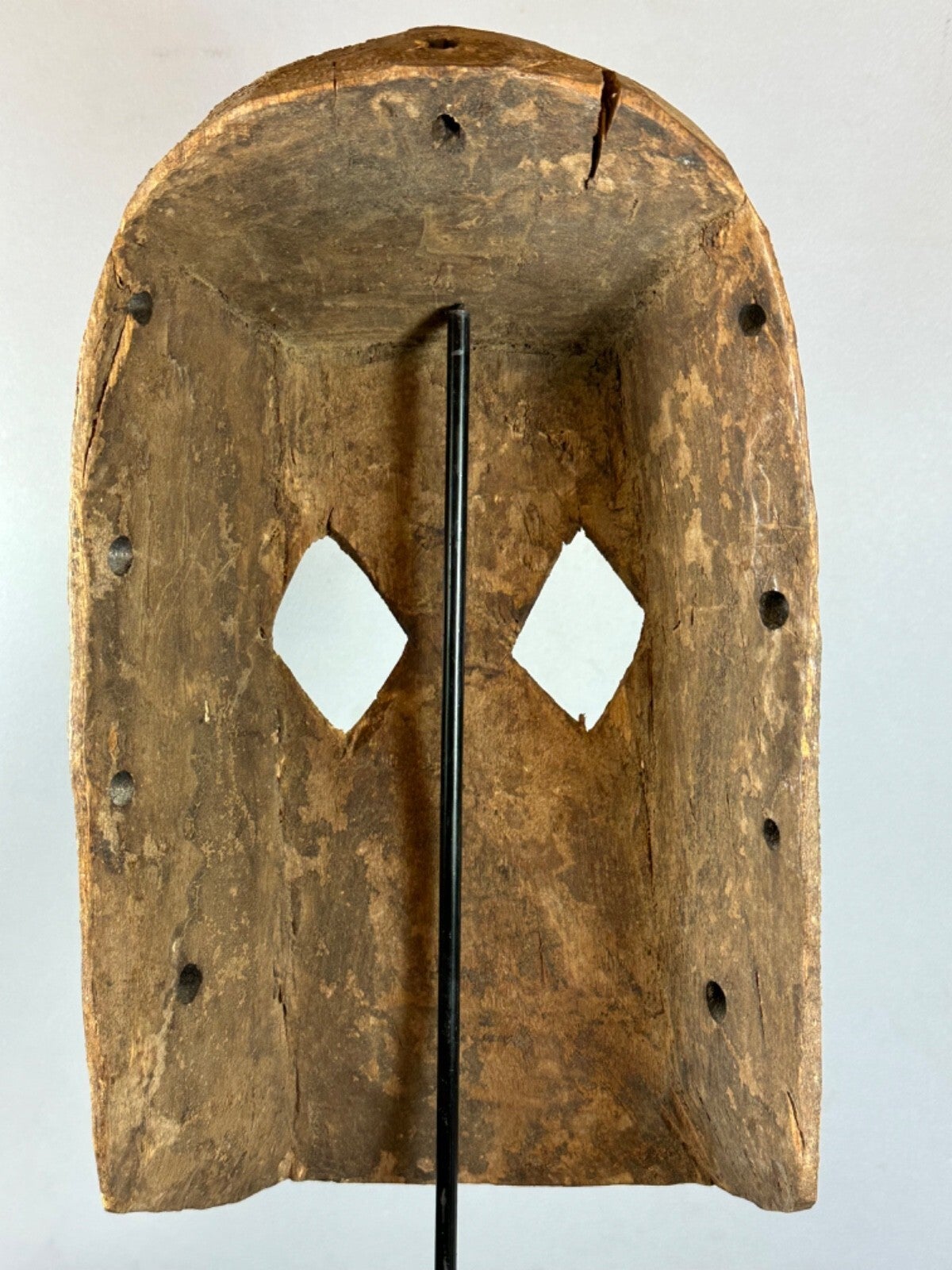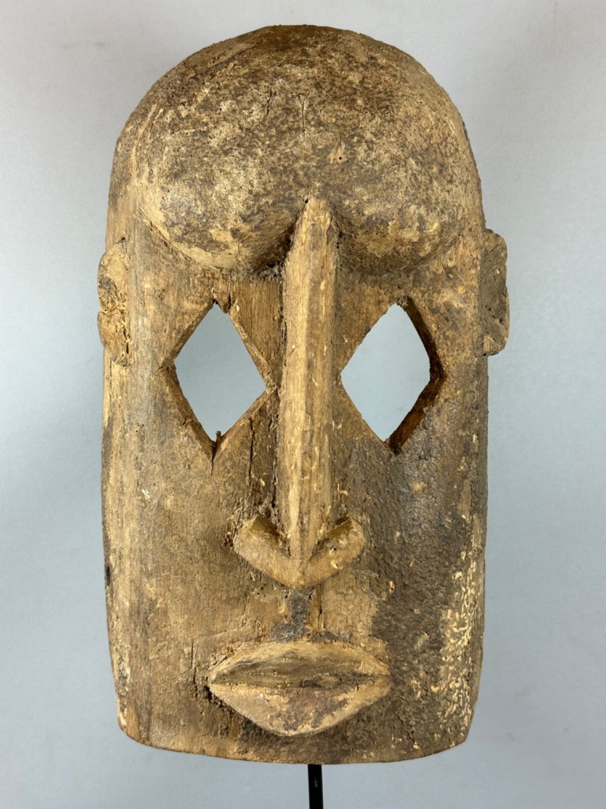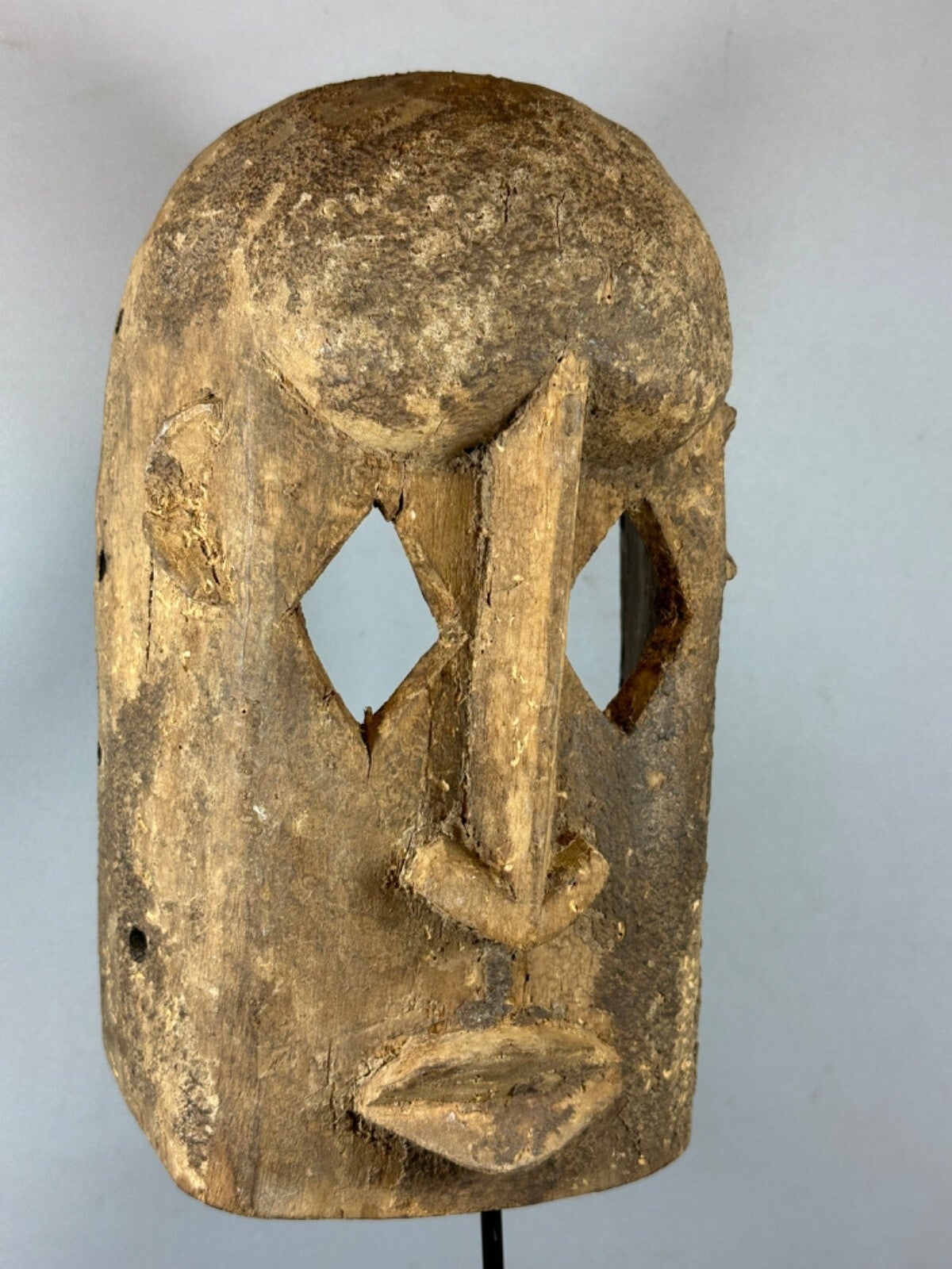 A Dogon mask depicting an abstracted human face showing traces of exposure to the elements on the surface .