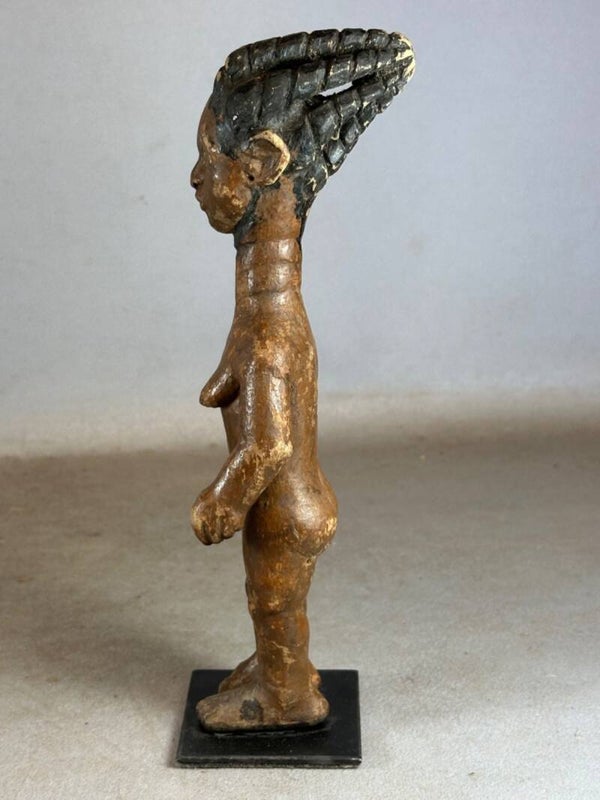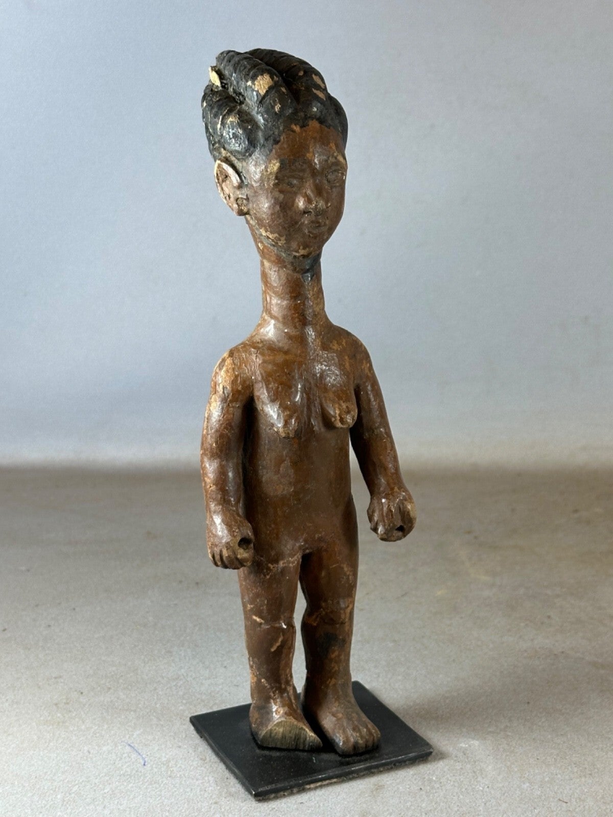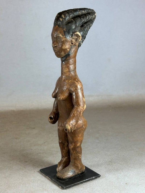 This statue is a beautiful example of the unusual Kulango sculpture. It bears the rounded, oval facial contour characteristic of Kulango art, while the pose and execution betray the influence of their neighboring tribes, including the Akan and the Baule. The woman stands with her legs directly under her body. This pose is directly related to similar Baule sculptures and is also seen in the famous Ashanti Akua'ba fertility dolls, made in the later figurative style. The woman's ribbed neck, suggesting an abundance of necklaces, is also related to the earliest Akua'ba types. Perhaps the most striking feature of this beautiful woman is her fantastic hairstyle. Her hair is a very beautiful eight-piece hairstyle, one of which is unfortunately partially missing. This type of statue was used for rituals and offerings to the healer and represents the epitome of feminine beauty, as seen by the Kulango tribe.