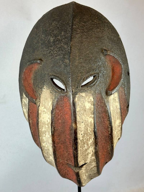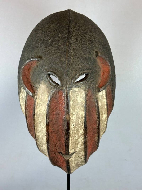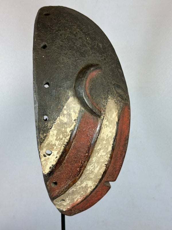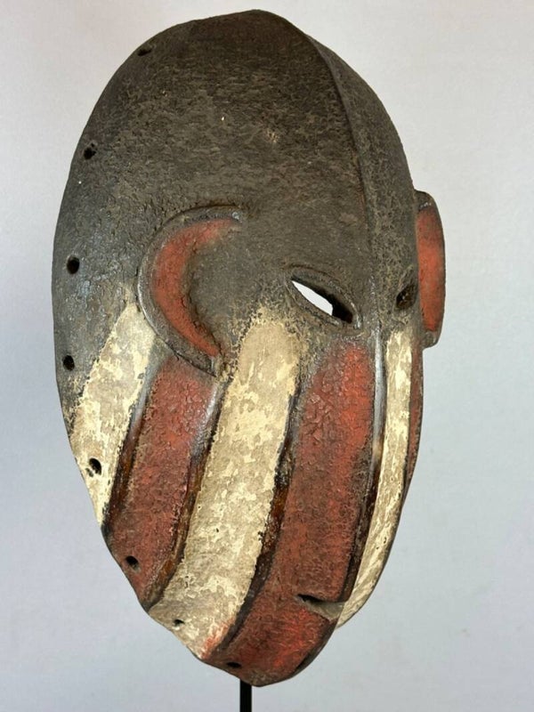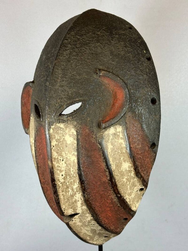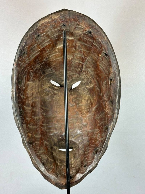 This almost flat African mask stands out for its naive appearance. Of Mbole or Yela origin, two close African ethnic groups in the DR Congo, there are oblique streaks under the eyes. These highly stylized traditional masks intervened during initiation rituals of which little is known because they took place away from the village, in secrecy.
