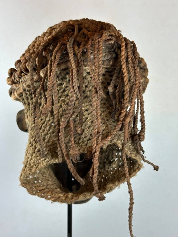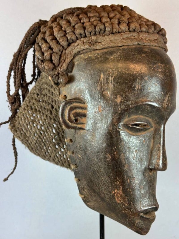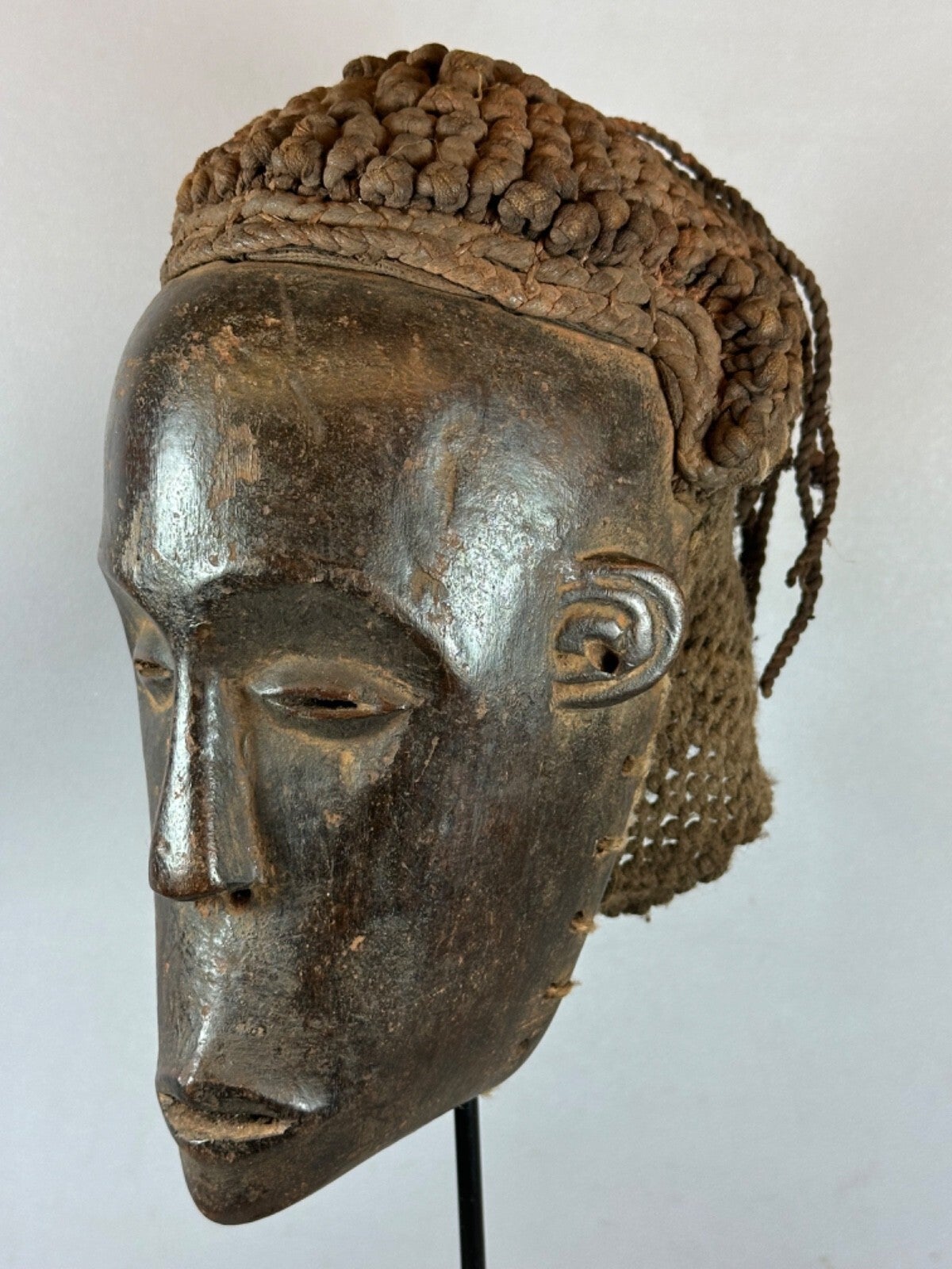 The face is brown in color with a smooth surface. The mouth is slightly open. On both ears are jewelry made of copper wire. The hair is made of cords, the net is made of textile fibers.This mask comes from the Chokwe people. It belongs to the famous category known as Mwana pwo and was performed during the ceremonies of circumcision and initiation of young boys. The headdress attached to the mask is well preserved. The face shows typical Chokwe carving patterns and expression.