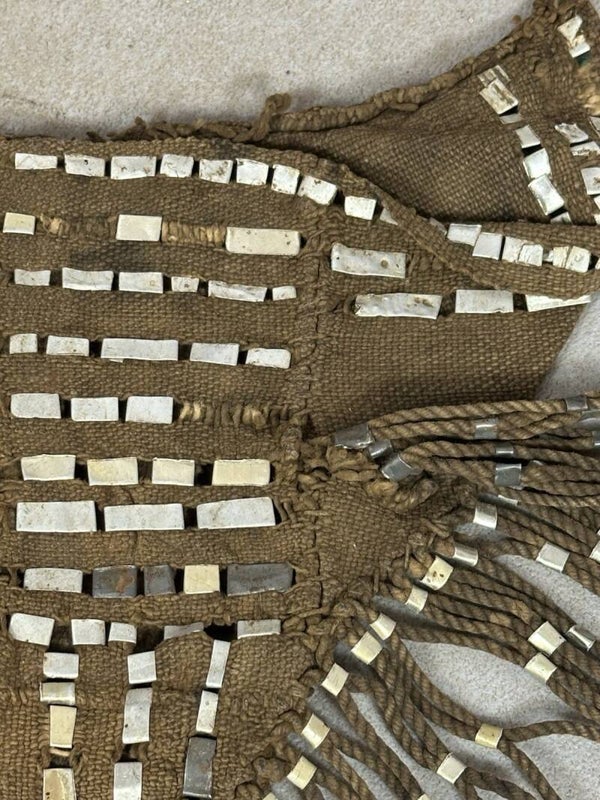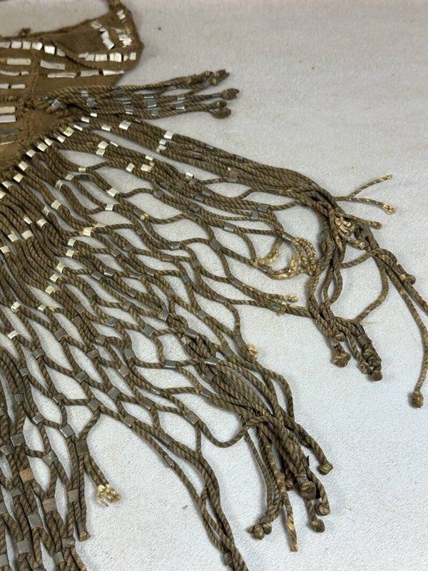The pouch has damage to the upper left corner. The strings under the bag are all tied together in a net structure with small pieces of aluminum.