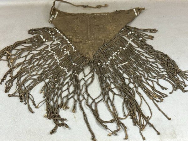 A brown TURKANA pouch or bag decorated with aluminum strips