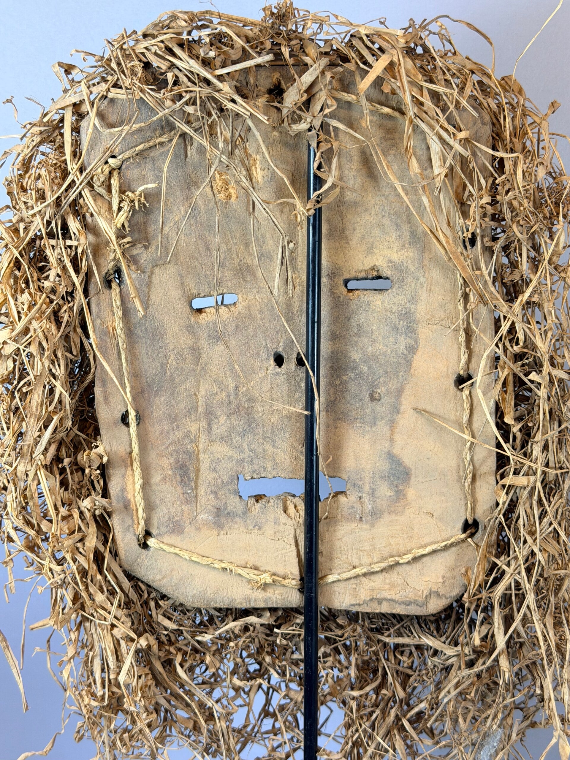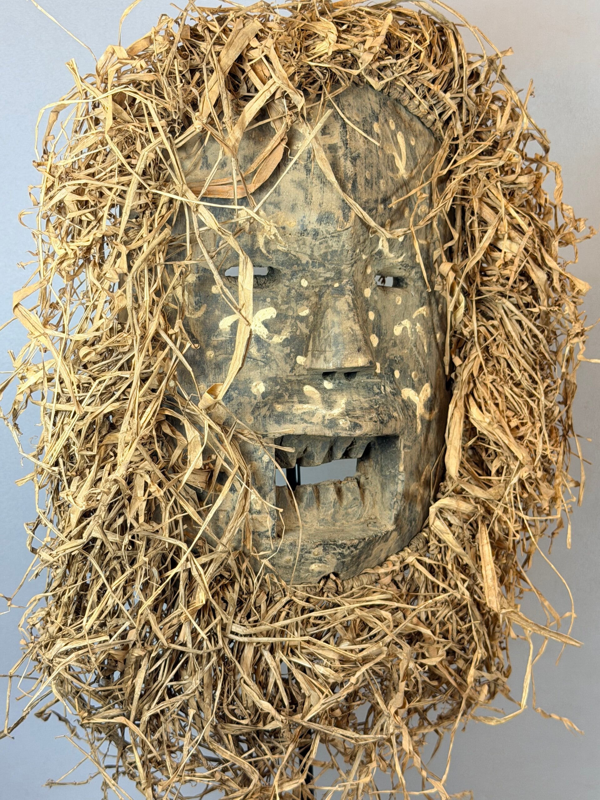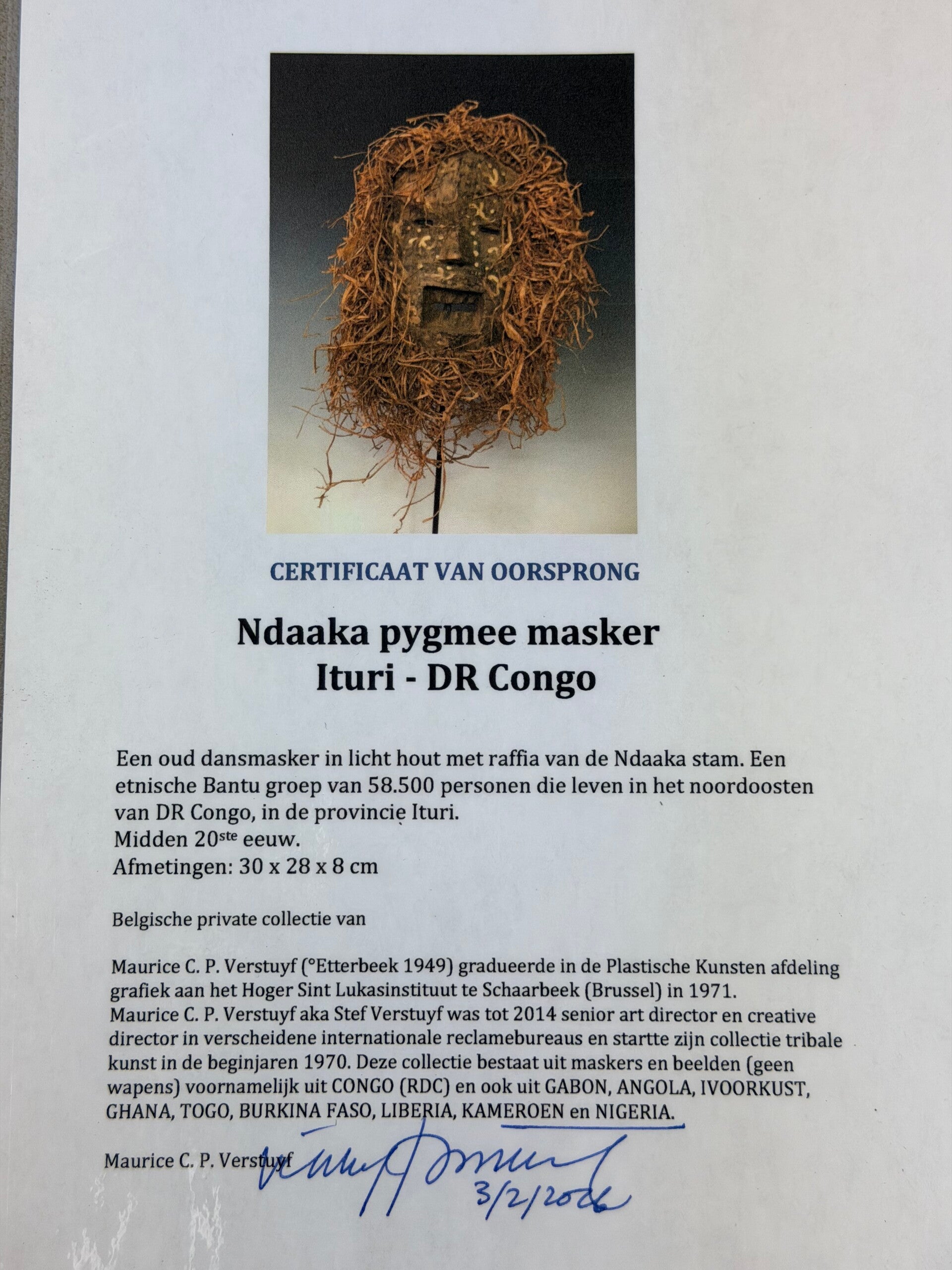 An old dance mask made of light wood with raffia from the Ndaaka tribe. A Bantu ethnic group of 58,500 people living in northeastern DR Congo, in the Ituri province. Good condition. Materials: wood, pigments, raffia. Includes a certificate of origin.