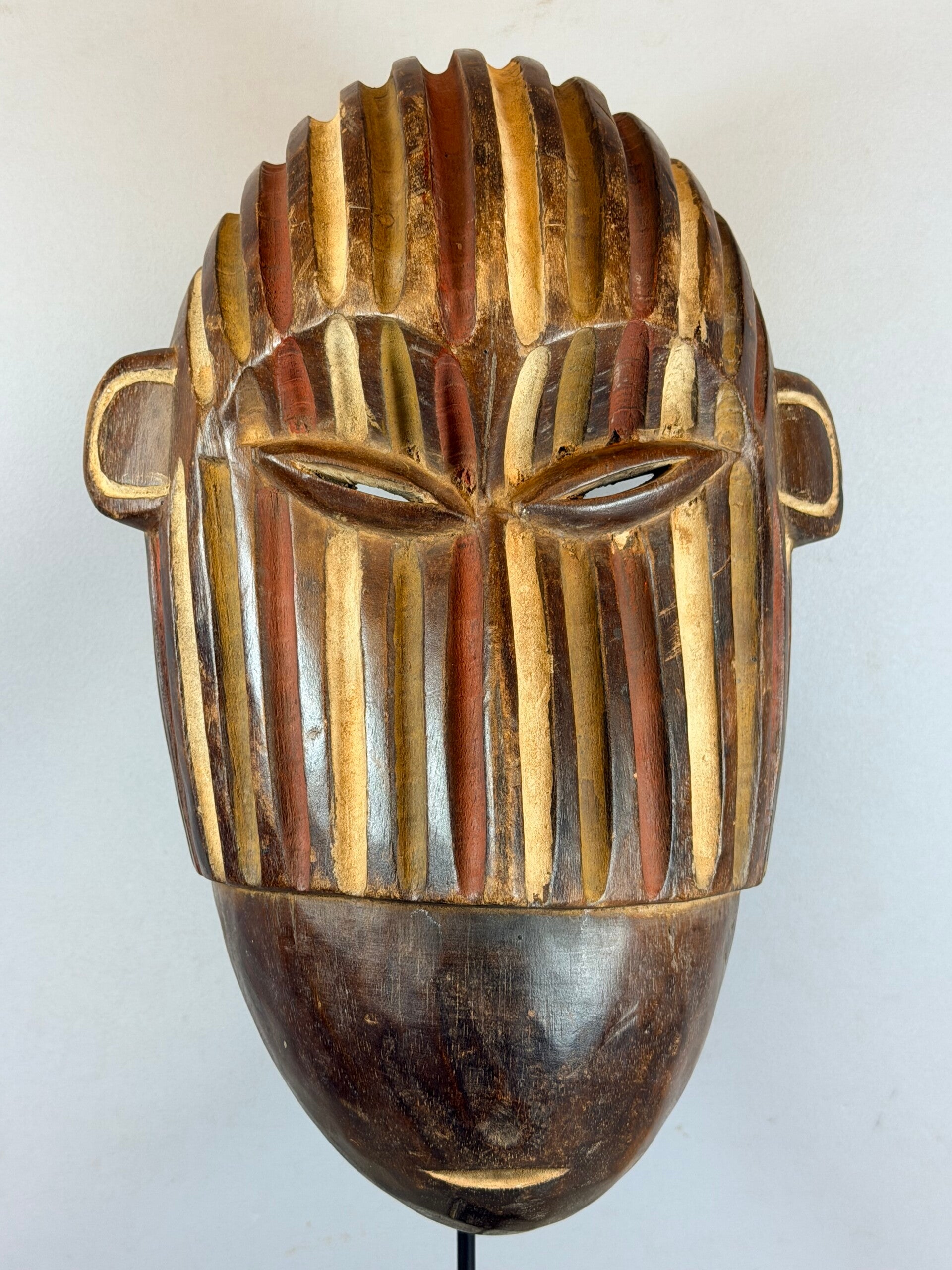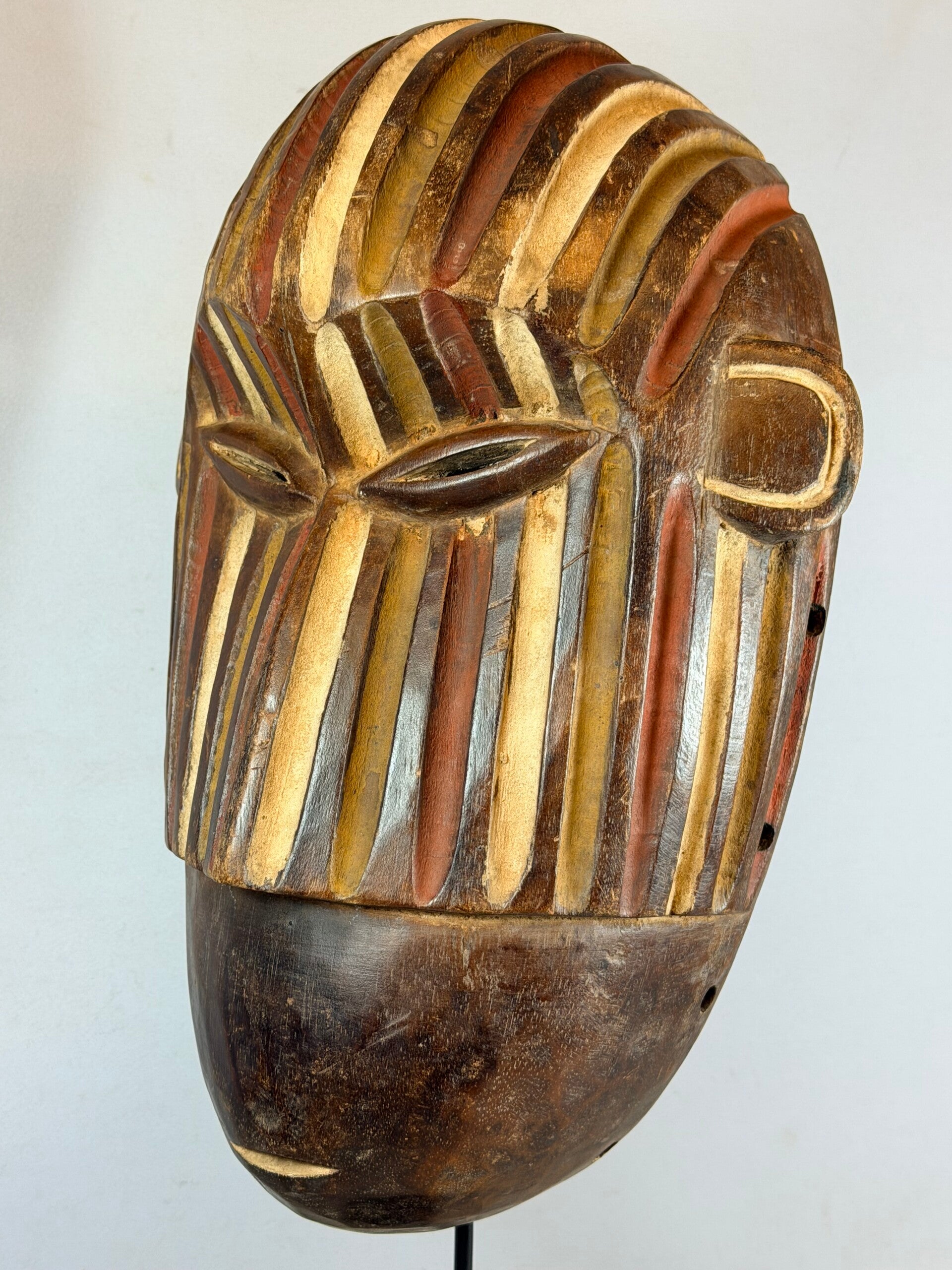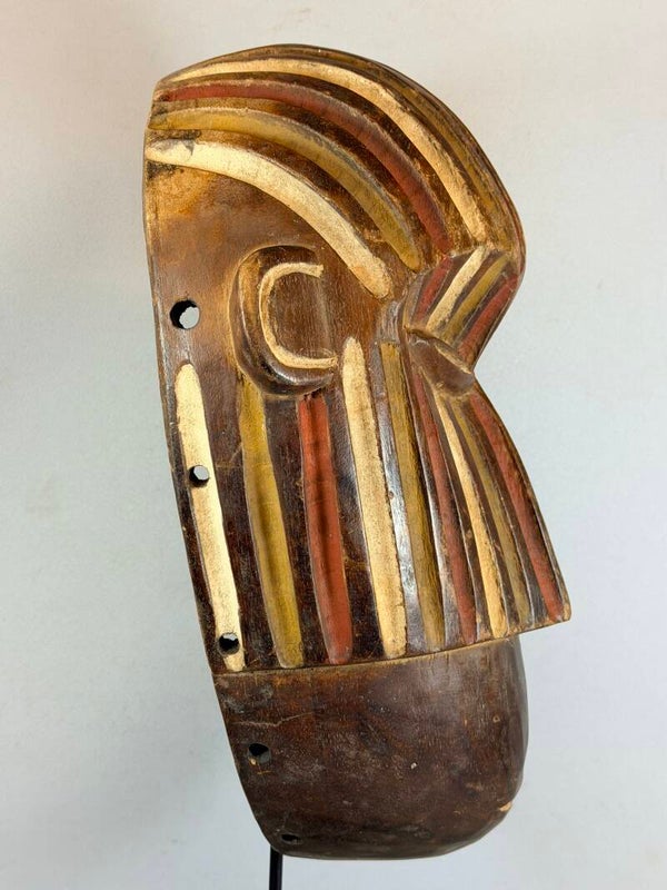 This almost flat African mask stands out for its naive appearance. Of Mbole or Yela origin, two close African ethnic groups in the DR Congo, there are oblique streaks under the eyes. These highly stylized traditional masks intervened during initiation rituals of which little is known because they took place away from the village, in secrecy.