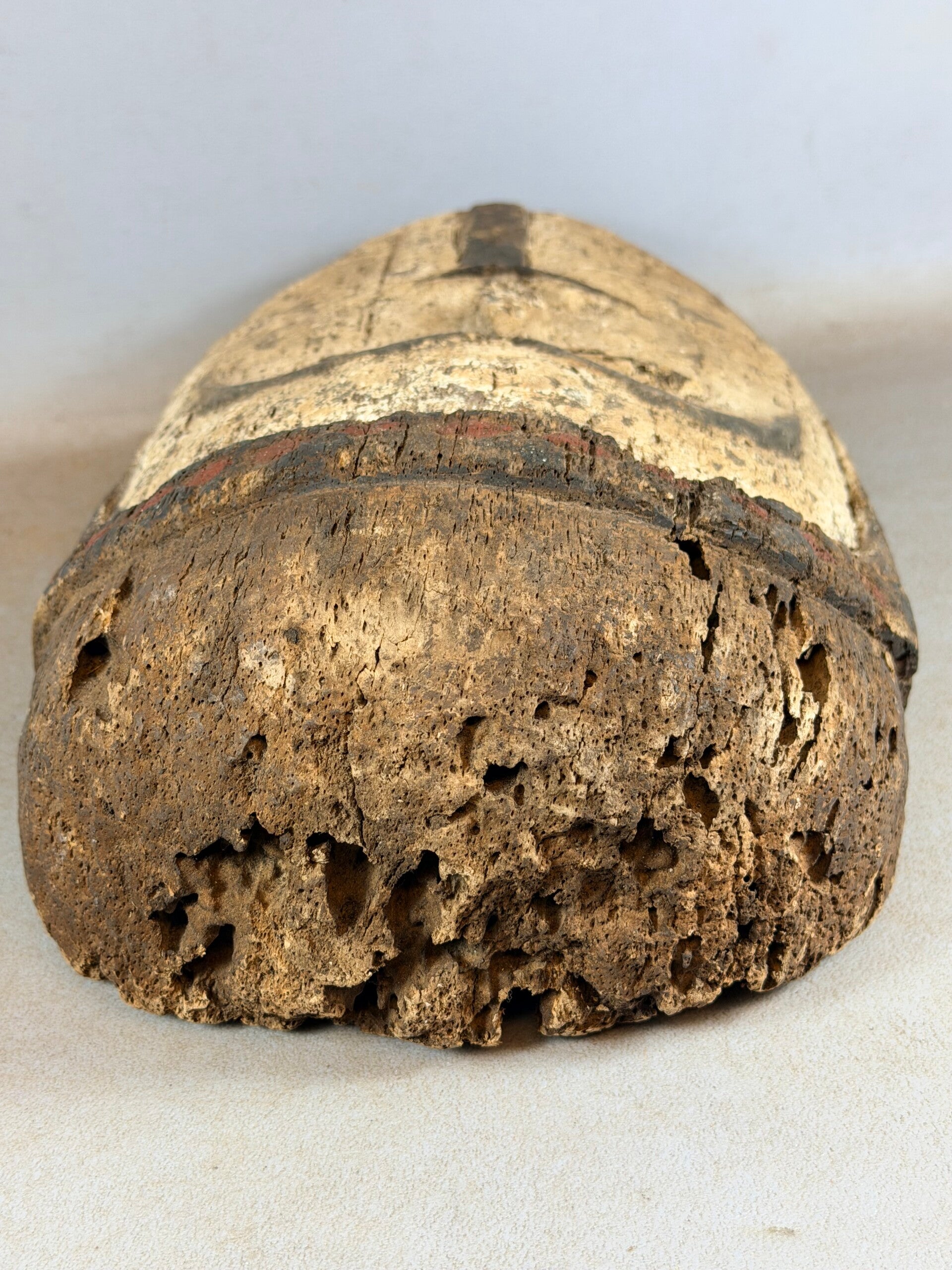 Hand carved from a single piece of wood, with kaoline color pigments and the mask is weathered by the ravages of time (wind, rain, insects)
