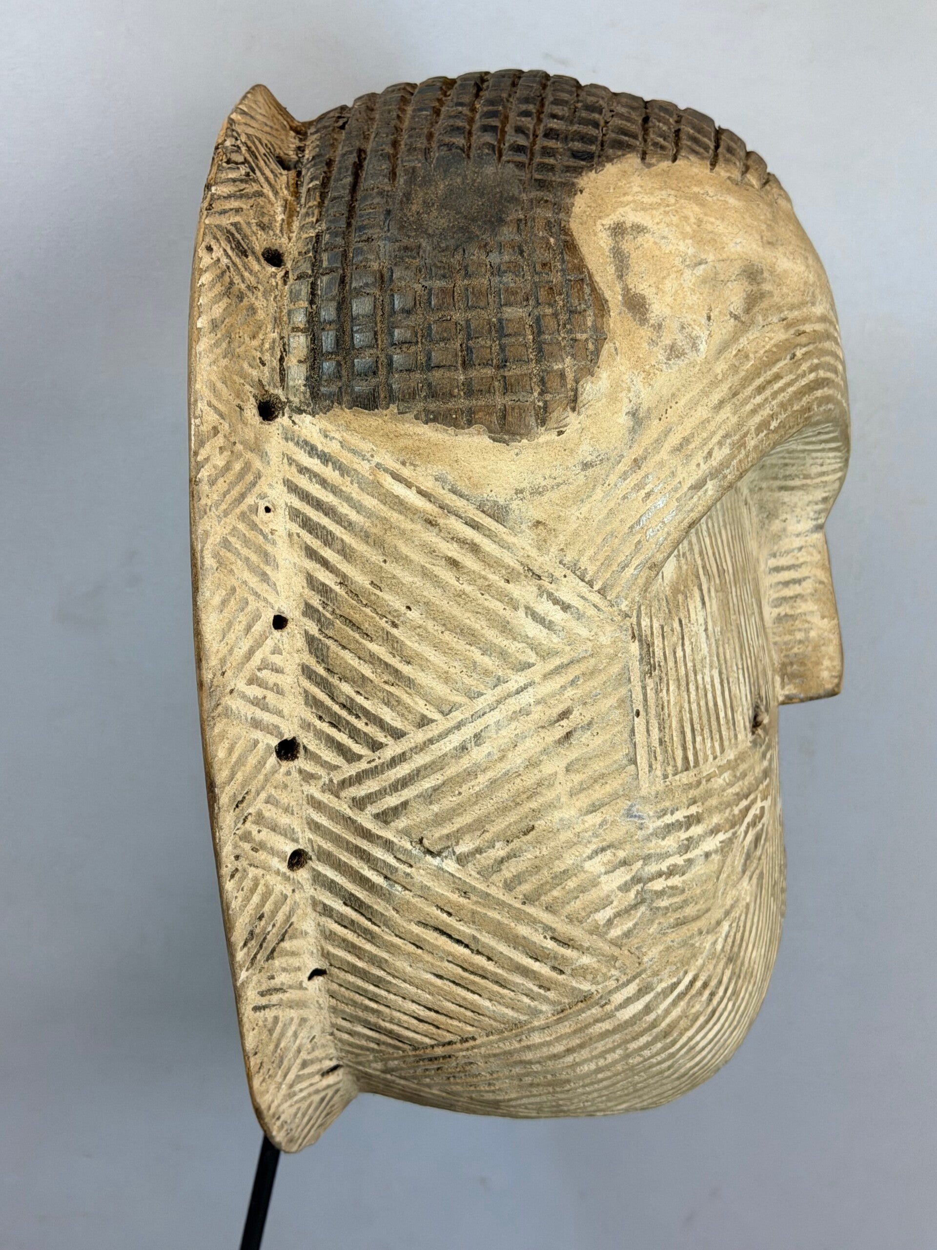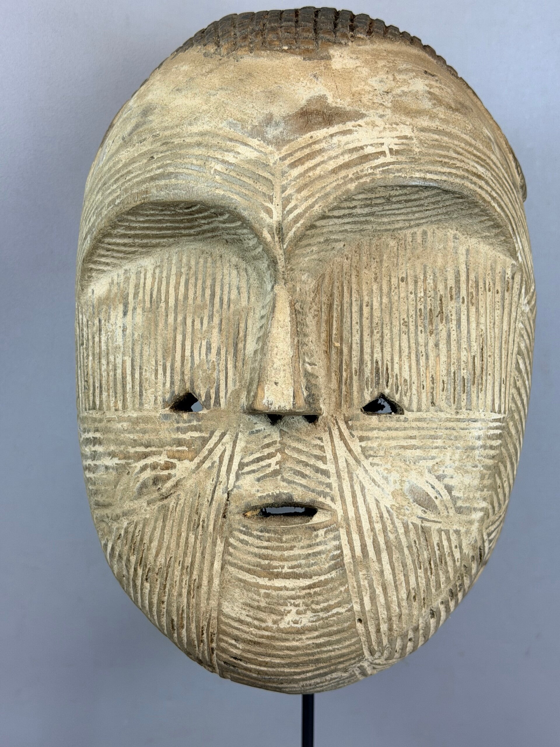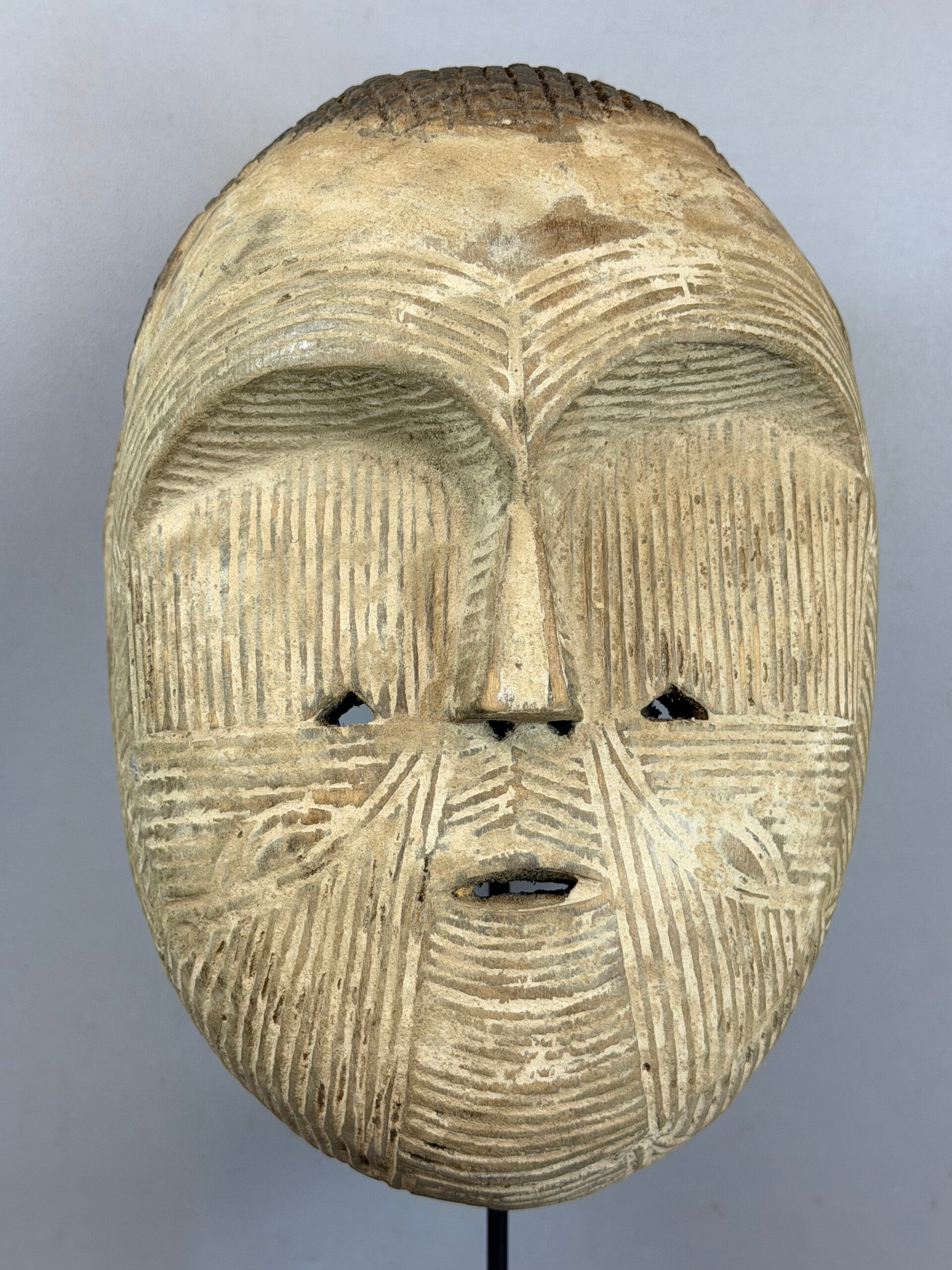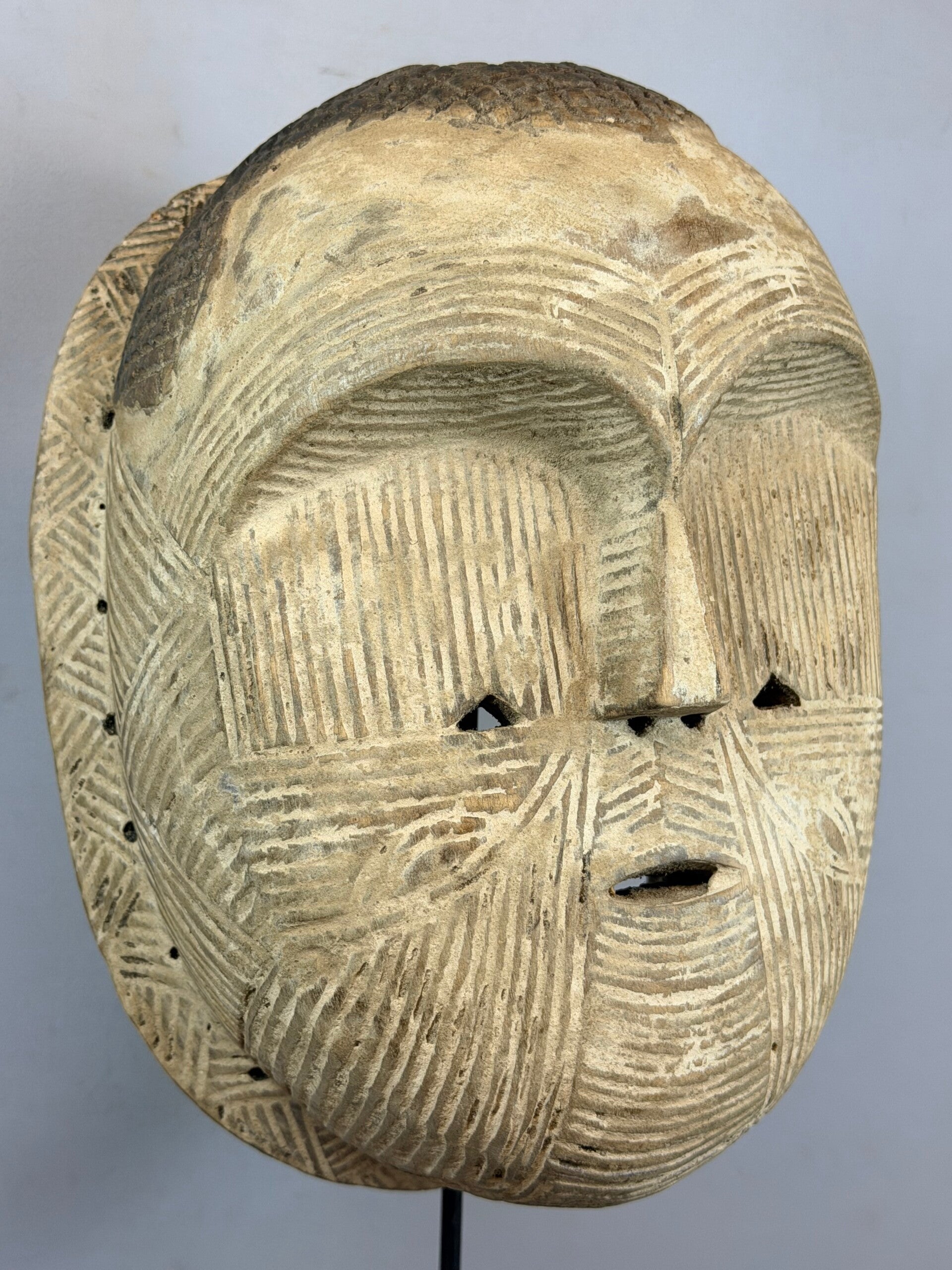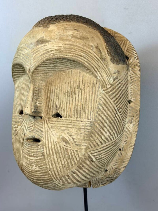 Tetela masks are relatively rare but hold deep ritual and symbolic significance. They are primarily used in ceremonies, secret society rituals, and initiation rites. These masks often feature geometric patterns, bold colors, and stylized human or animal features. Some are influenced by neighboring tribes like the Kuba and Songye, incorporating spiritual and ancestral elements. They may represent spirits, ancestors, or serve as protective symbols.